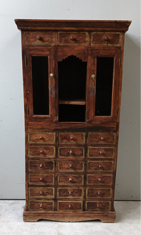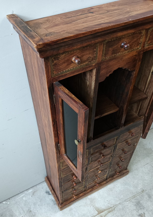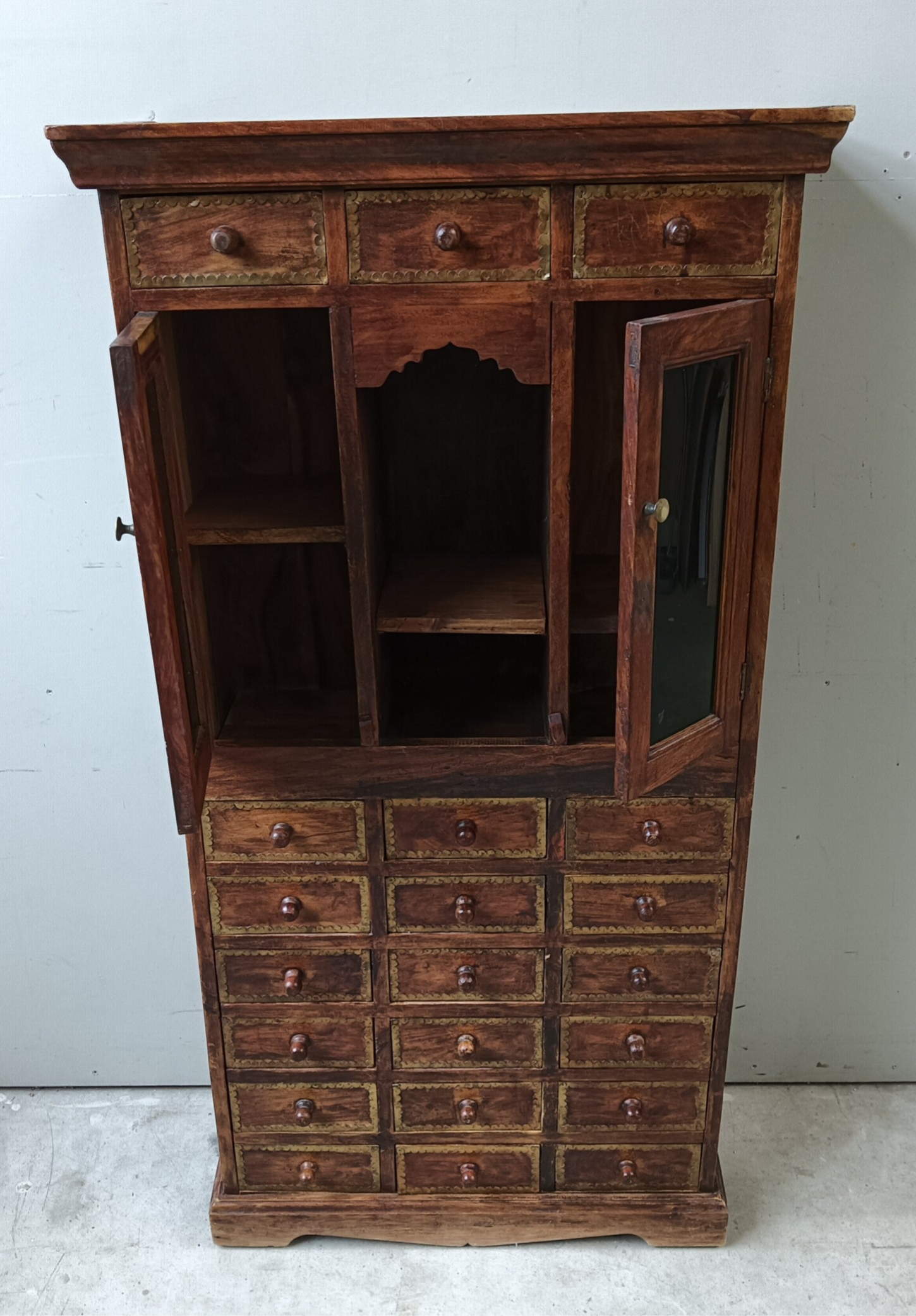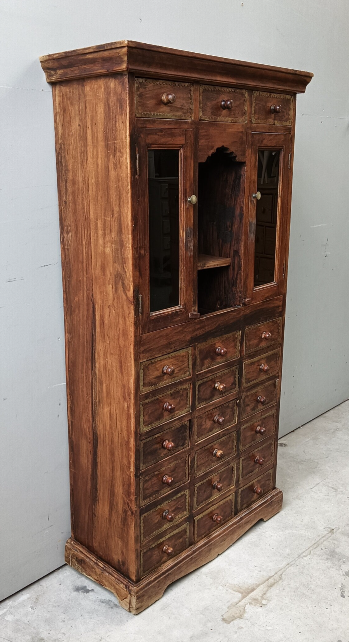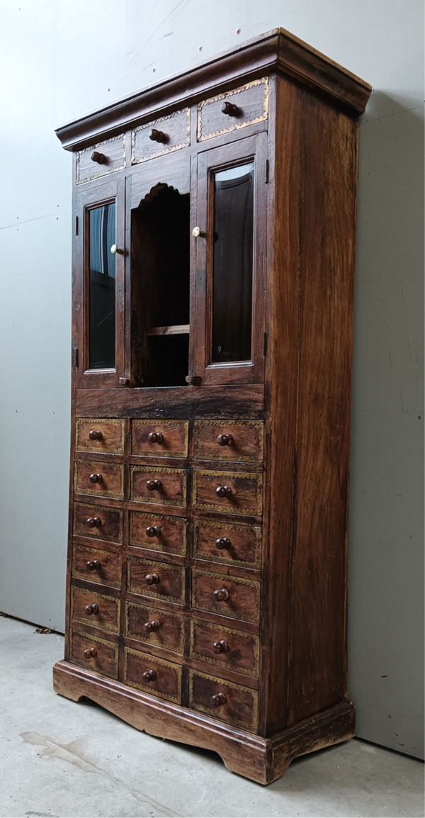 Wat een bijzonder kastje is dit. Orgineel oosters geinspireerd apothekerskastje. Prachtige vormgeving, super veel laatjes en verfijnde details rondom. Naast de laatjes ook nog een leuk vak waar je wat kan tonen en 2 deurtjes met getint raamwerk waar achter je ook nog van alles kwijt kan! Werkelijk een uniek exemplaar. Nog volledig in orginele staat. Hoewel.... er voor het "verplaats" gemak wieltjes onder geplaats zijn ( zie je niet, maar zijn er wel :-))