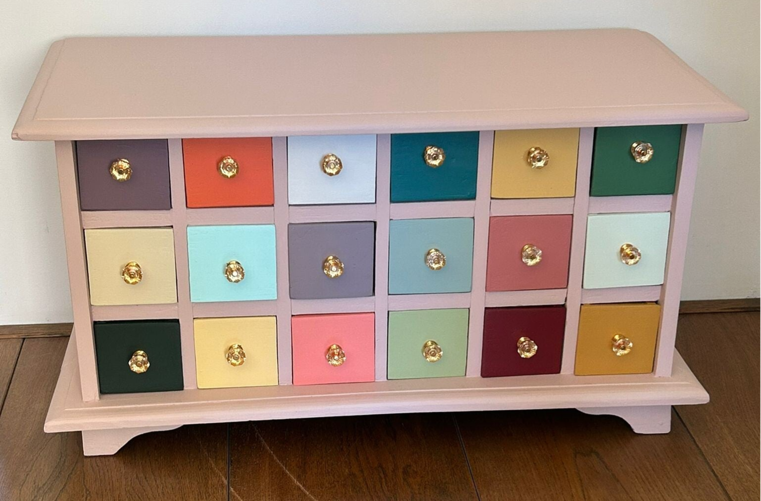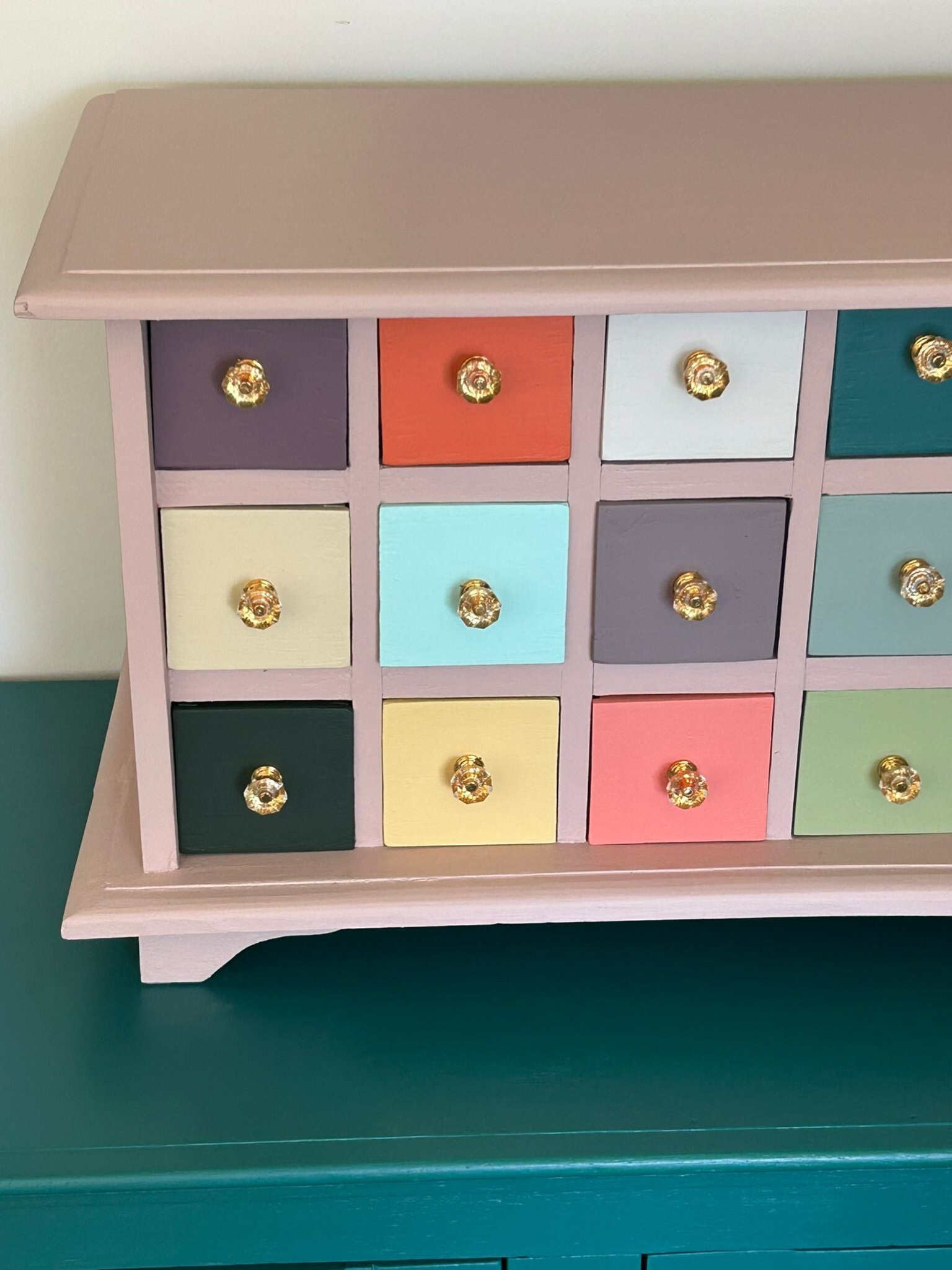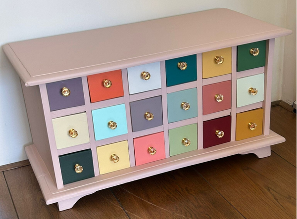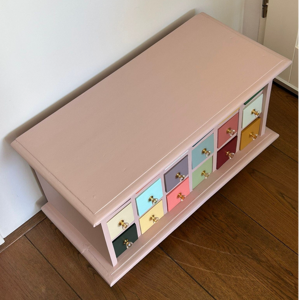 Wow, hoe leuk is dit kastje geworden !!! Een net even anders dan anders apothekerskastje. Dit komt mede door zijn bescheiden afmetingen, maar natuurlijk ook door zijn kleurtjes en die waanzinnig toffe knopjes. Al met al een heerlijk vrolijk ladenkastje met genoeg plek voor allerlei spul :-)
