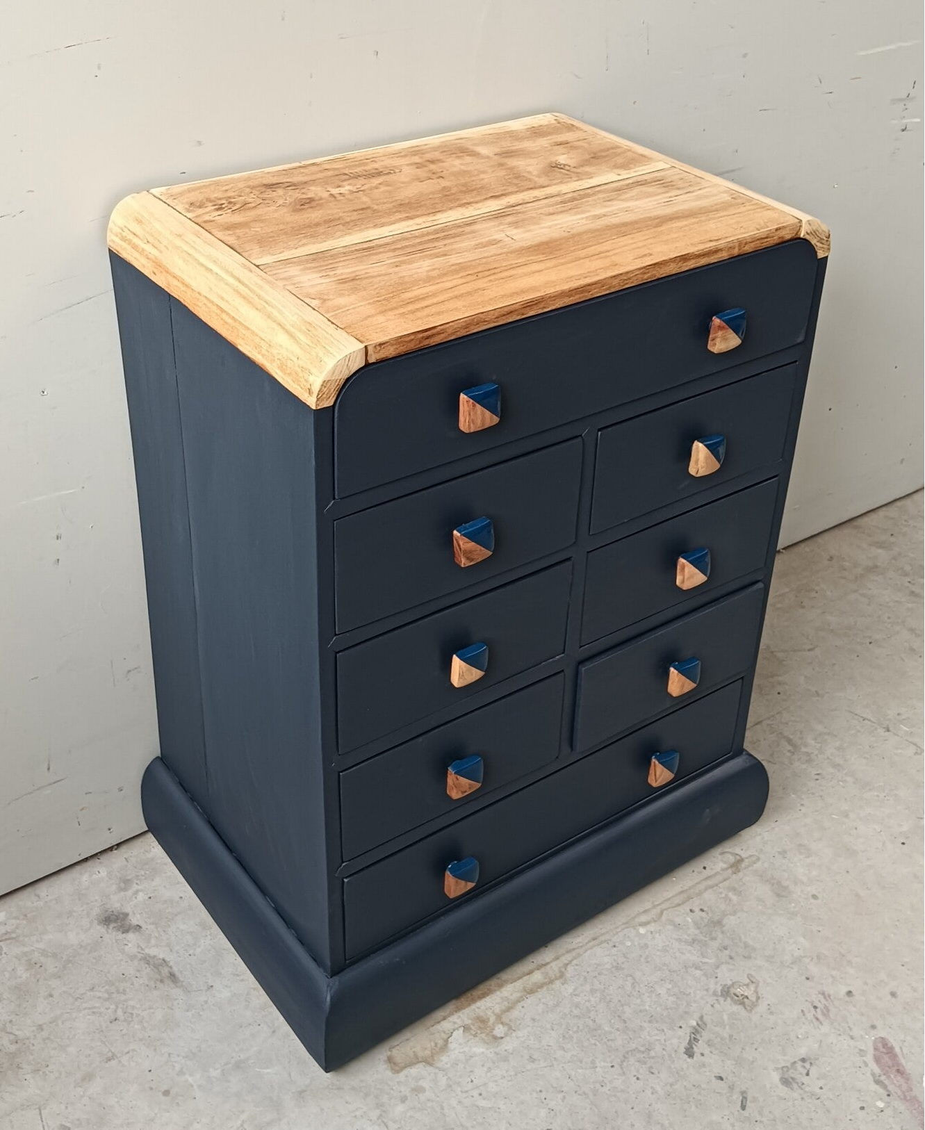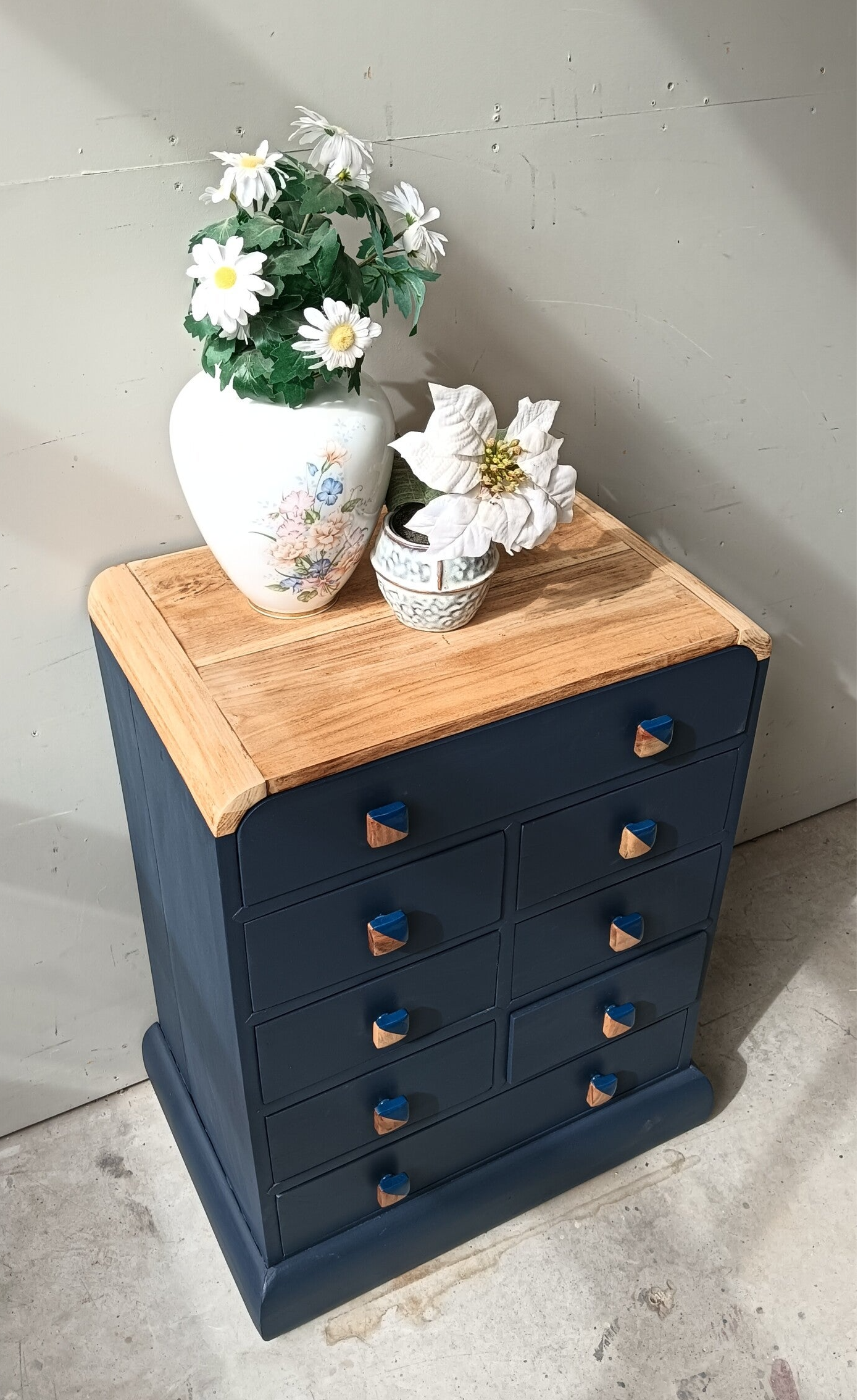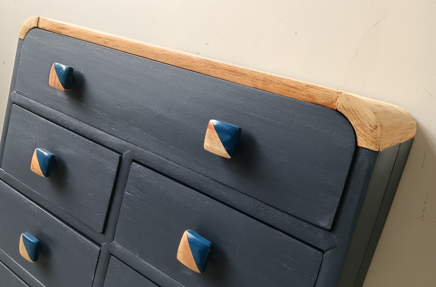 Een oude, van origine thaise, ladenkast. Helemaal omgetoverd tot een mooie en in het oogspringende kast. De kleur, Midnight Blue is een intens diepe kleur blauw van Fusion Mineral Paint en dat in combinatie met de prachtige knoppen op de lades beslag.....zeg nou zelf, helemaal te gek toch!??! De prachtige vormgeving en het natuurlijke houten blad, is wat ons betreft een heerlijk samenkomen. Deze kanjer kan natuurlijk super goed dienen als dressoir, hal kast of.....nou zoveel plekken waar hij goed kan staan en dienst doen !
