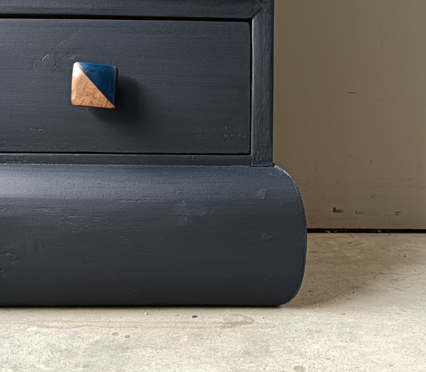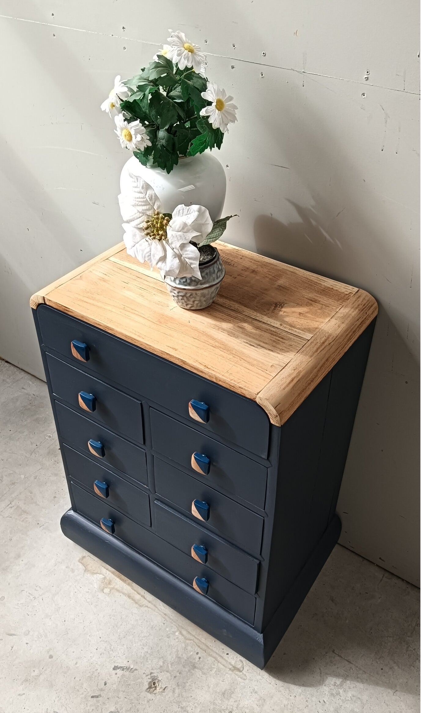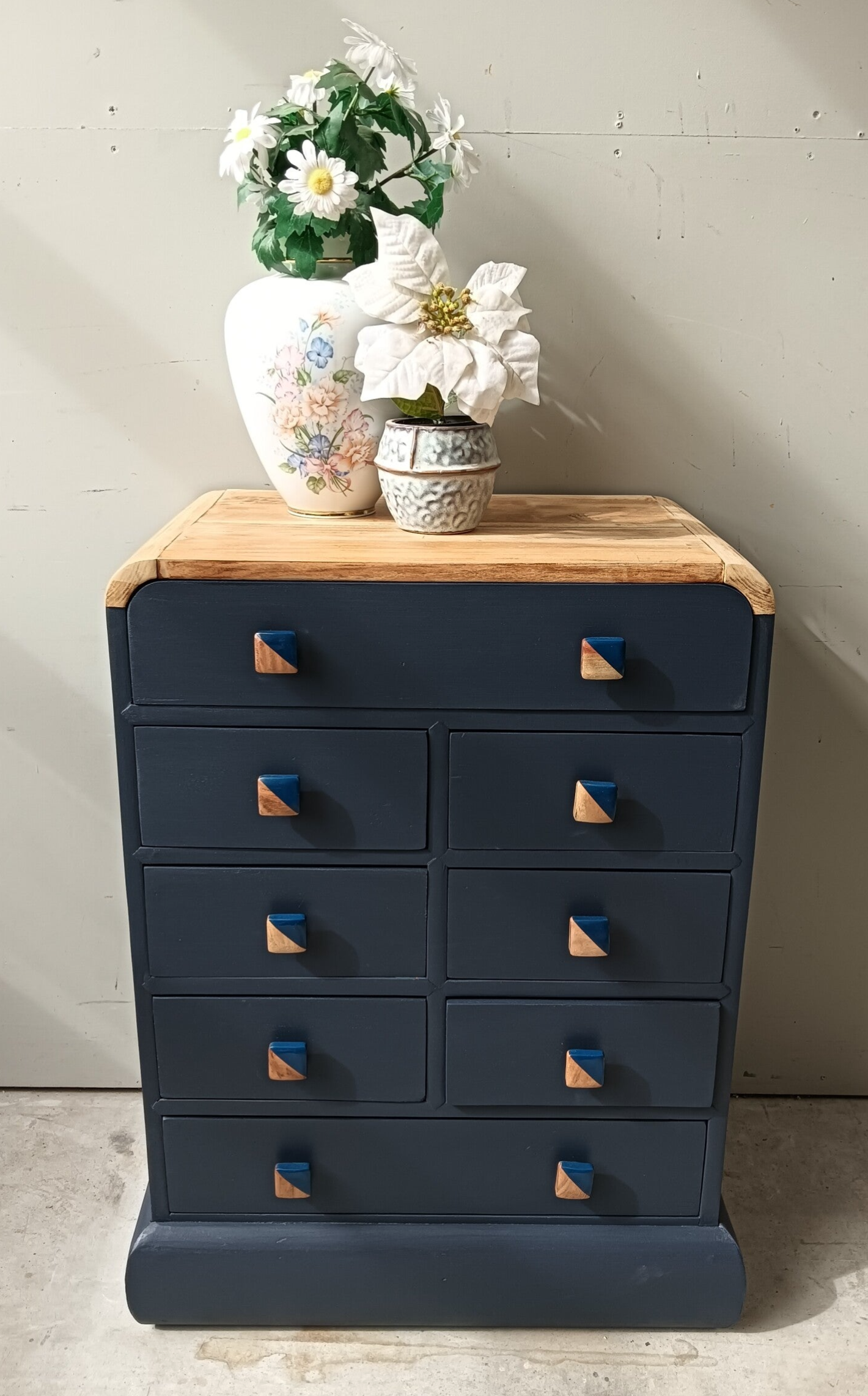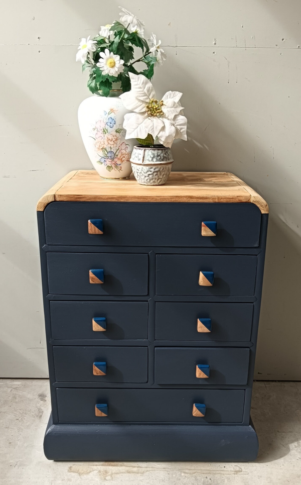 Een oude, van origine thaise, ladenkast. Helemaal omgetoverd tot een mooie en in het oogspringende kast. De kleur, Midnight Blue is een intens diepe kleur blauw van Fusion Mineral Paint en dat in combinatie met de prachtige knoppen op de lades beslag.....zeg nou zelf, helemaal te gek toch!??! De prachtige vormgeving en het natuurlijke houten blad, is wat ons betreft een heerlijk samenkomen. Deze kanjer kan natuurlijk super goed dienen als dressoir, hal kast of.....nou zoveel plekken waar hij goed kan staan en dienst doen !