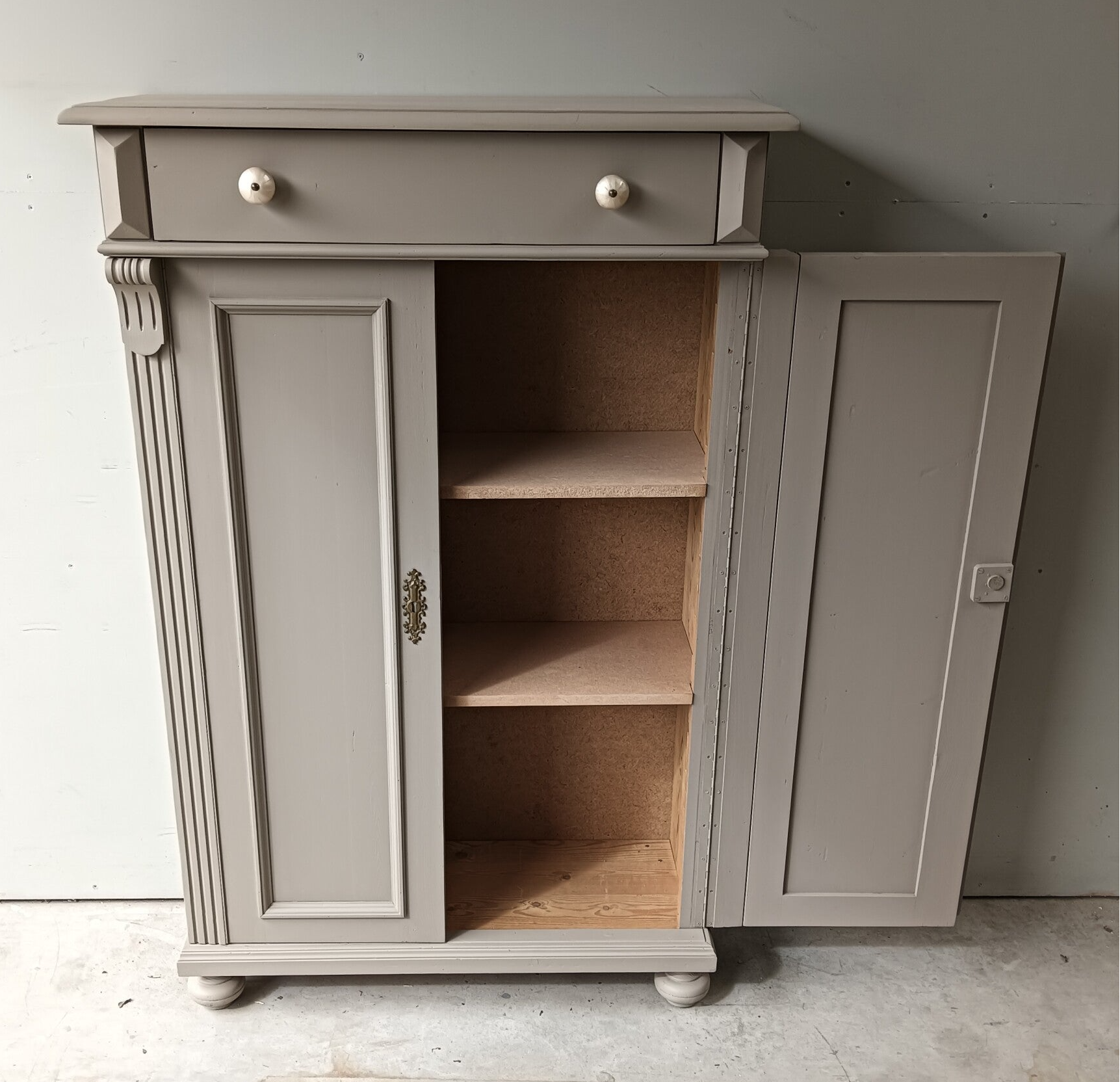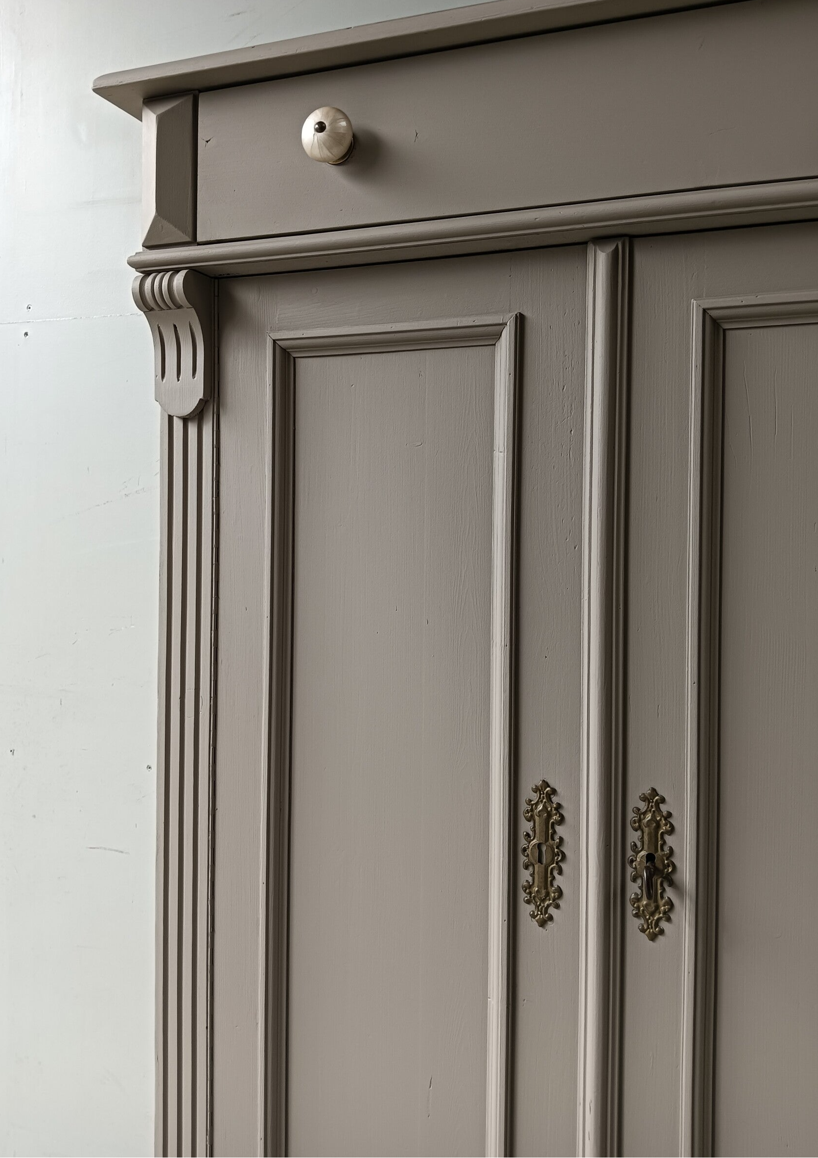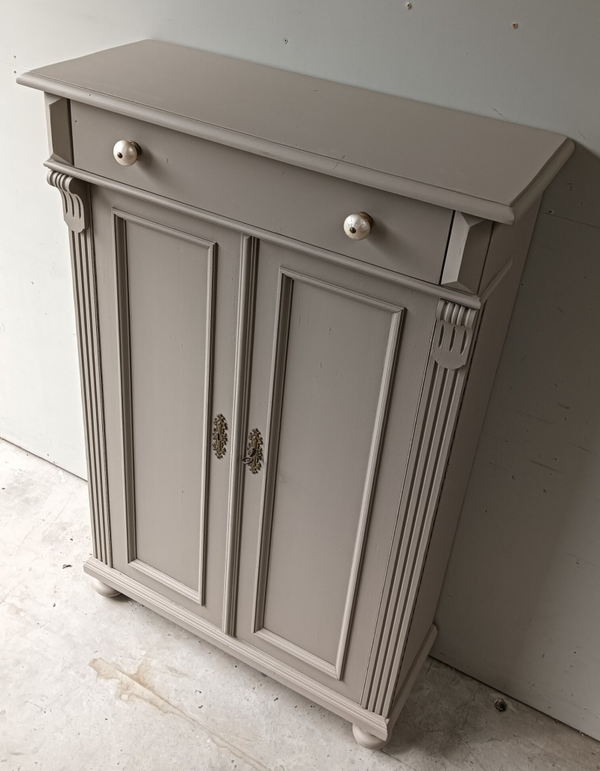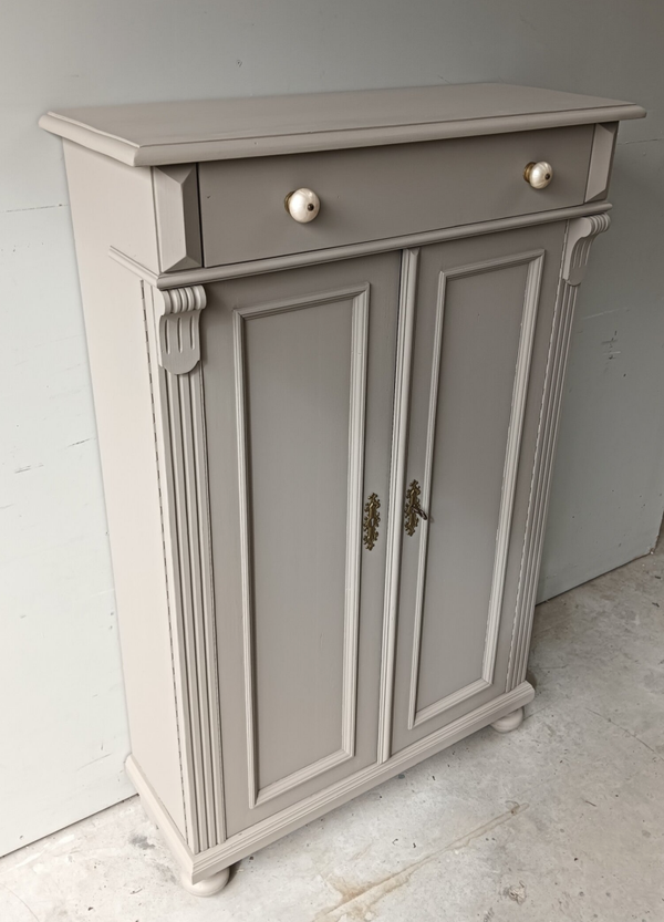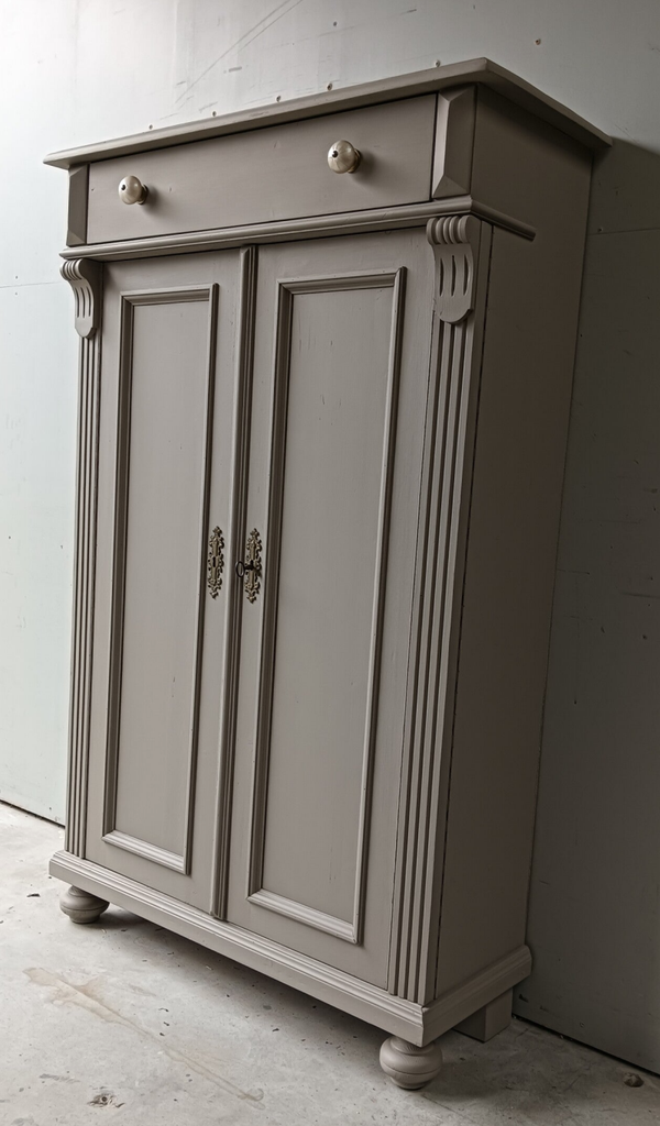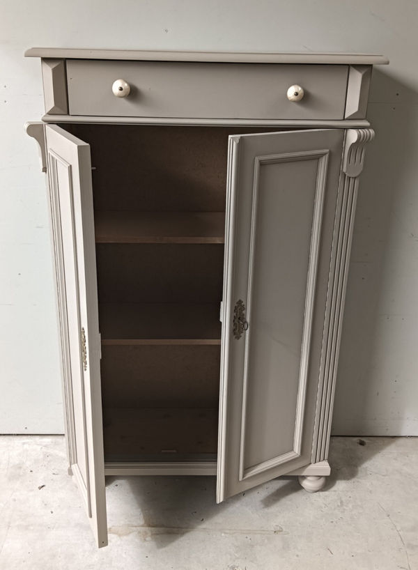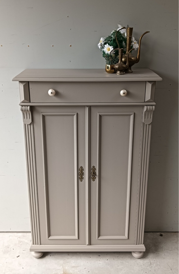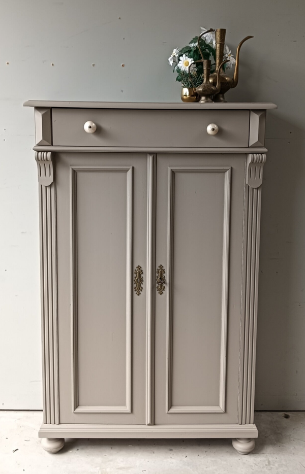 Hoe mooi is deze kast geworden in de kleur Algonquin van Fusion Mineral Paint. Een prachtig en warme taupe tint !!! Prachtige zogenaamde "meidenkast' met lade en achter de deurtjes heerlijk wat planken. Toffe bijpassende knoppen mochten op deze kanjer natuurlijk niet ontbreken! Op de deuren zit het orginele beslag met een werkend slot en bijbehorende sleutel. Een fijn formaat met een stijlvolle uitstraling.