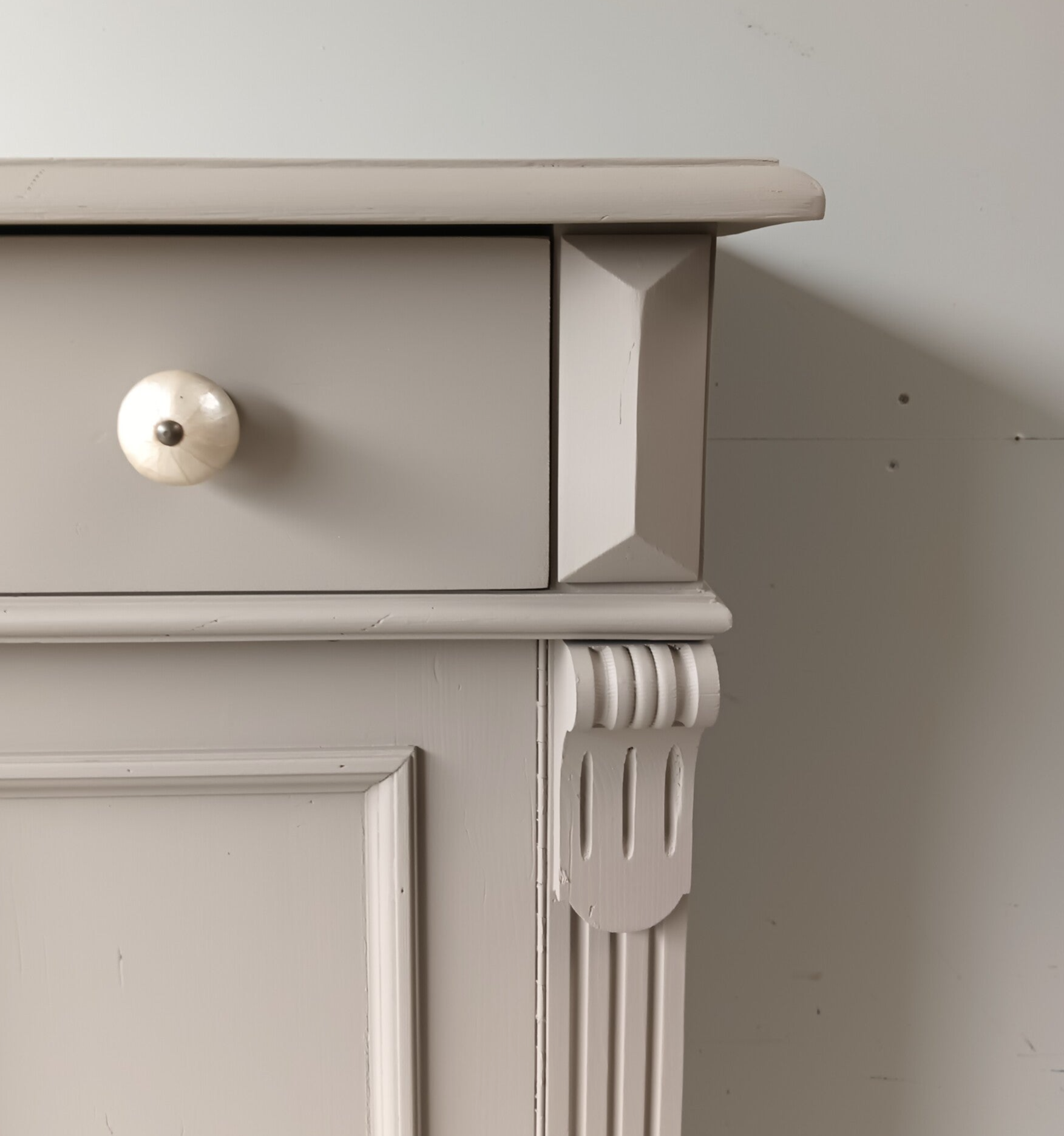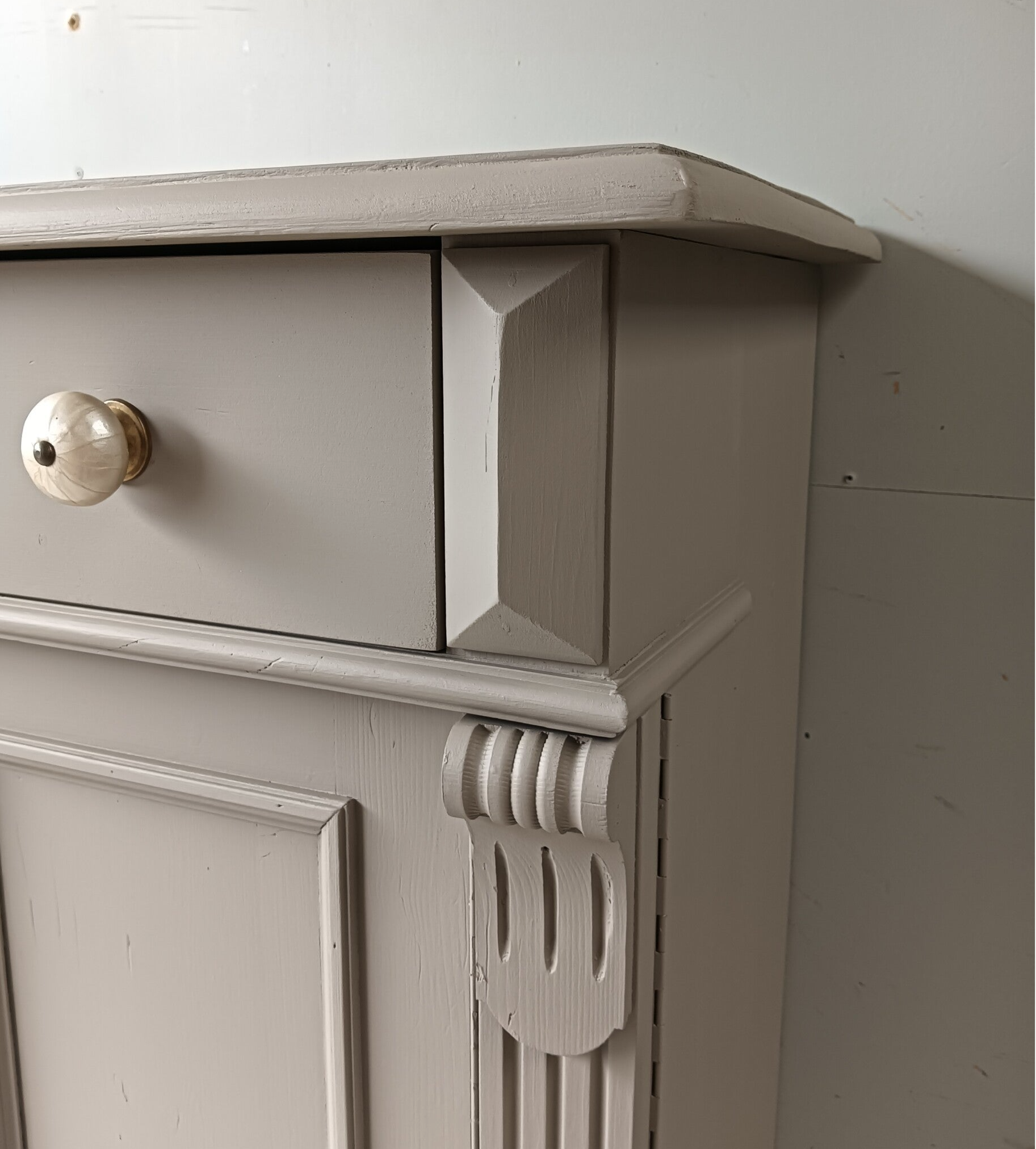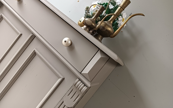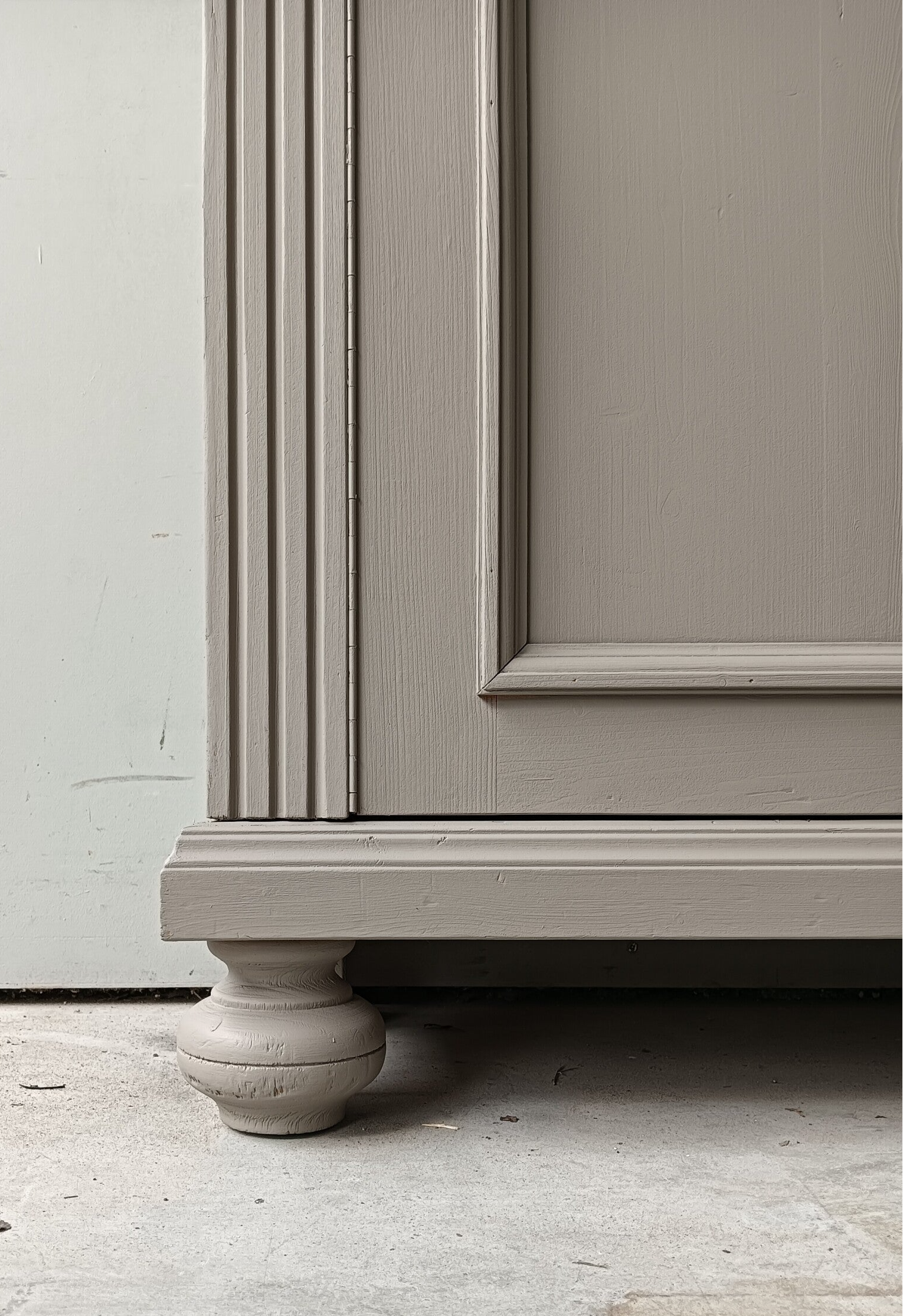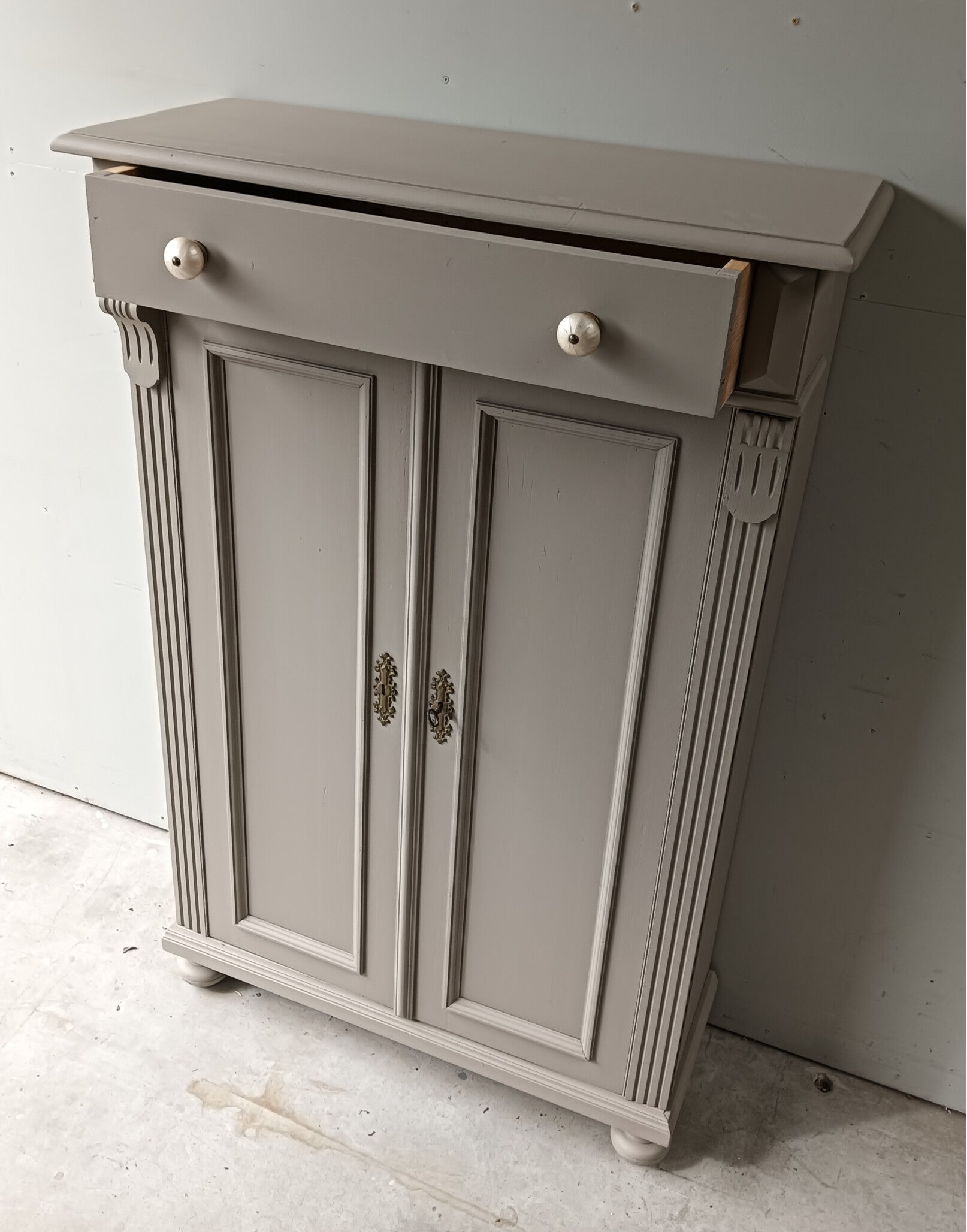 Hoe mooi is deze kast geworden in de kleur Algonquin van Fusion Mineral Paint. Een prachtig en warme taupe tint !!! Prachtige zogenaamde "meidenkast' met lade en achter de deurtjes heerlijk wat planken. Toffe bijpassende knoppen mochten op deze kanjer natuurlijk niet ontbreken! Op de deuren zit het orginele beslag met een werkend slot en bijbehorende sleutel. Een fijn formaat met een stijlvolle uitstraling.