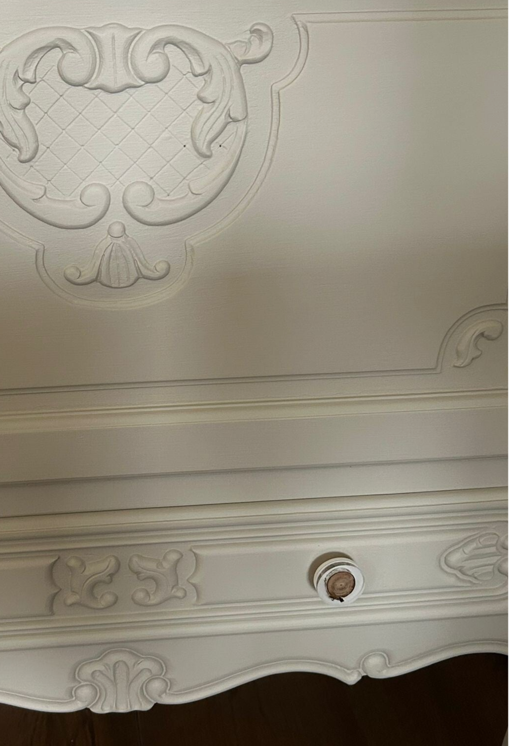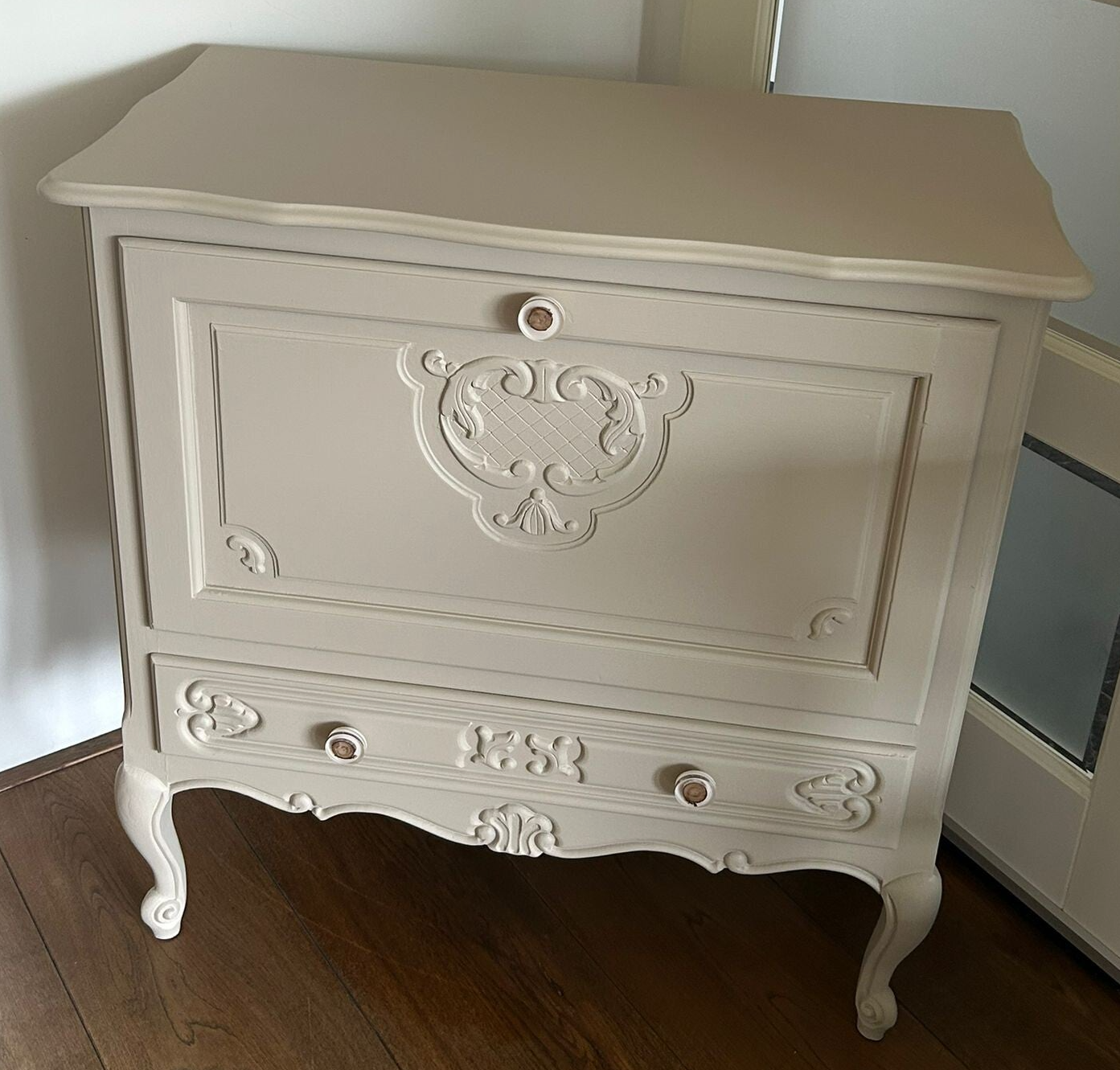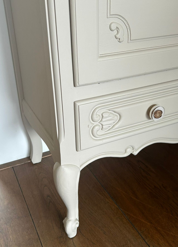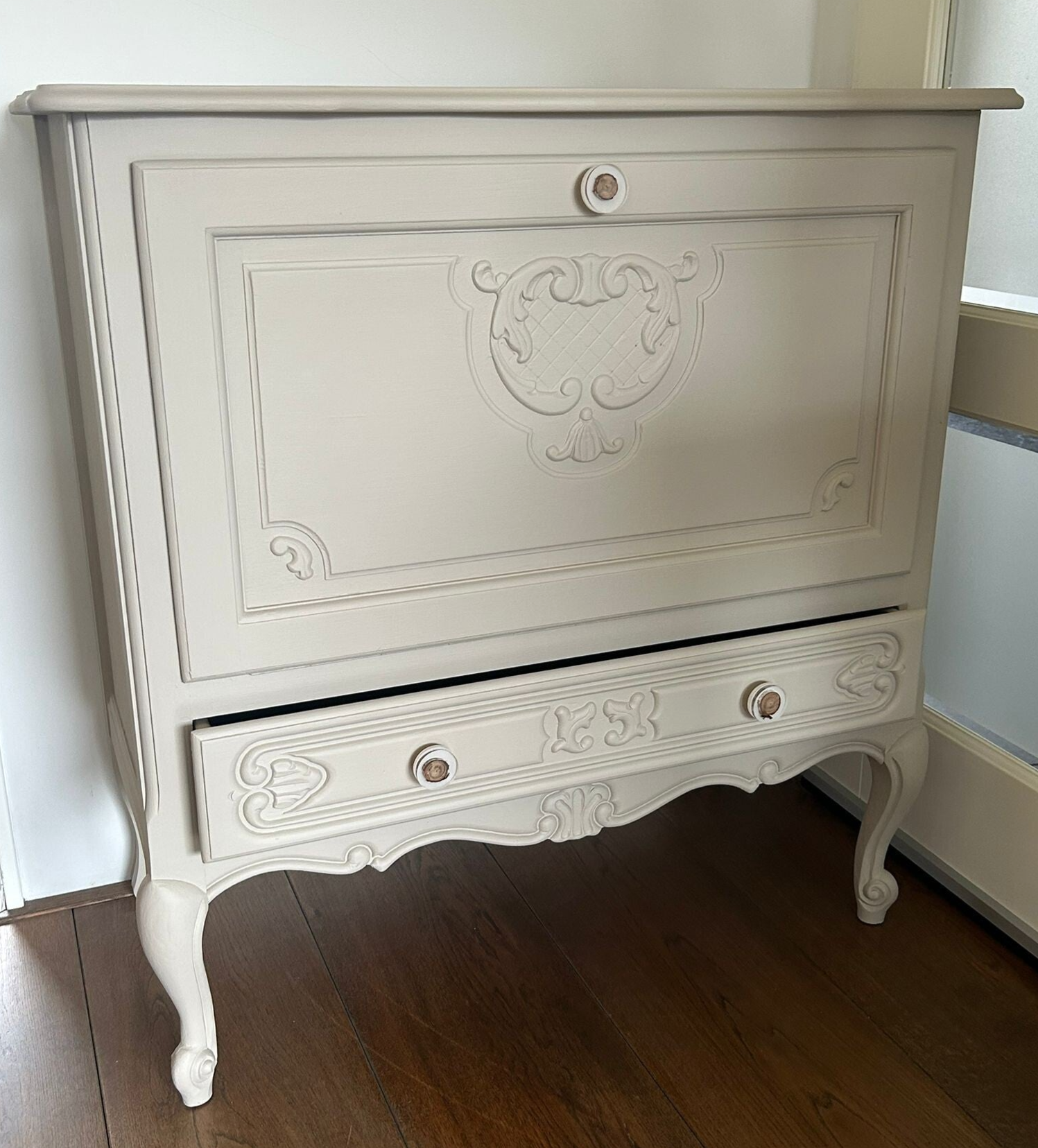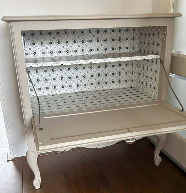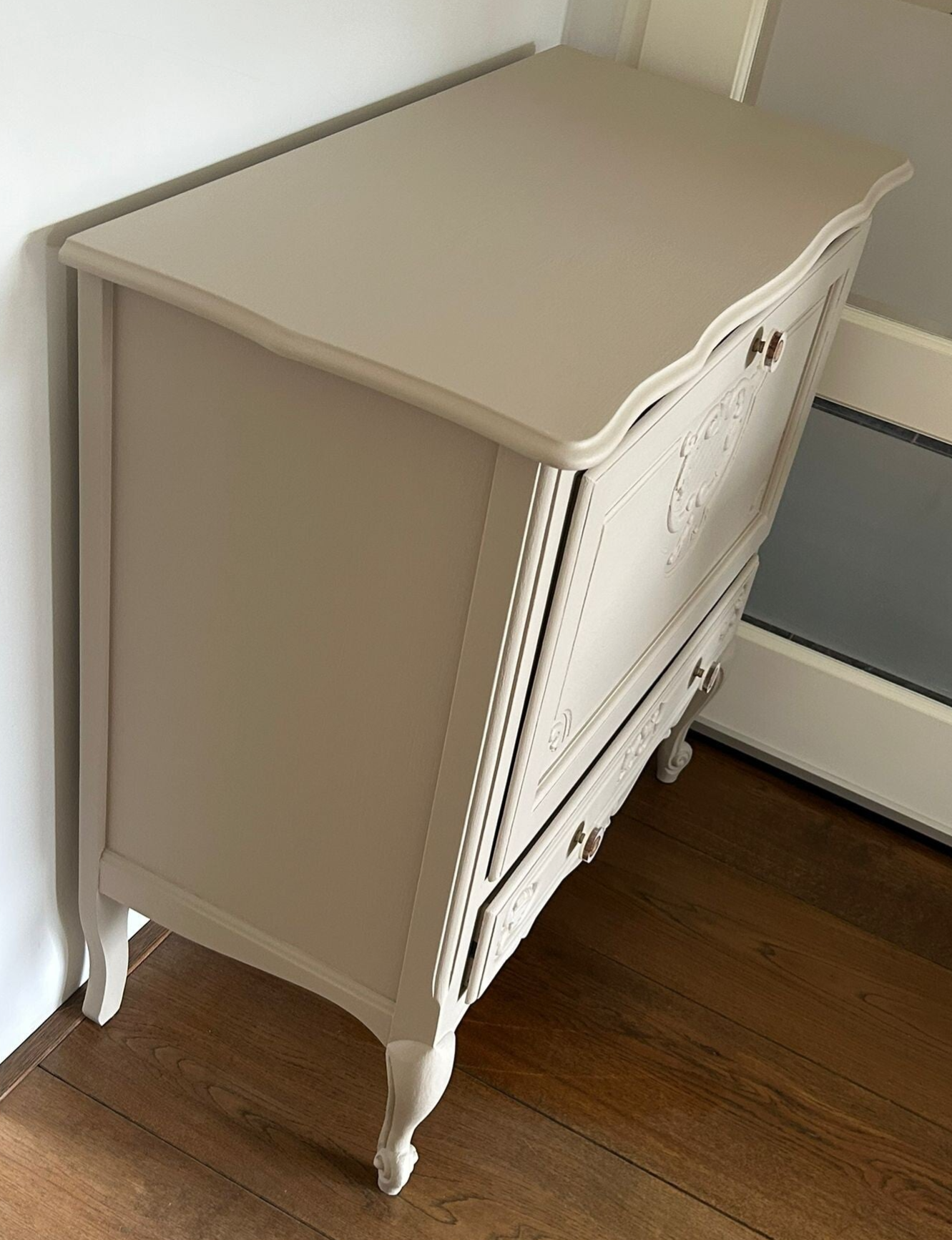 Een mooie en sierlijk vormgegeven wandkastje. De kleur Cathedral Taupe van Fusion Mineral Paint, is een lichte taupe tint, warm en stijlvol tegelijk, wat deze Lady Queen best goed draagt. De knoppen die we hebben uitgezocht zijn wat ons betreft een super match qua stijl en uitstraling. Overigens heeft de binnenzijde ook een bijpassend design gekregen. Dit kastje is goed te gebruiken als dressoir of als tv kast. Nou....mogelijkheden zat volgens mij !