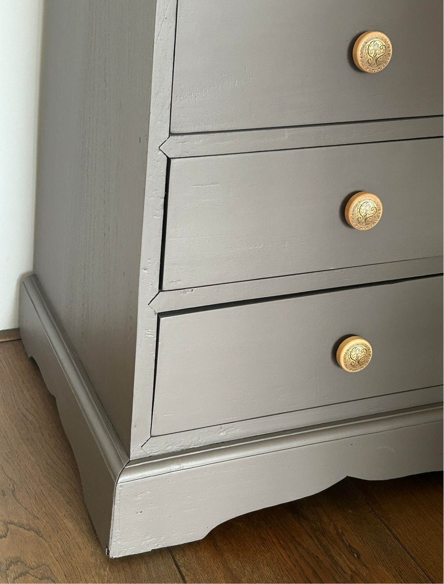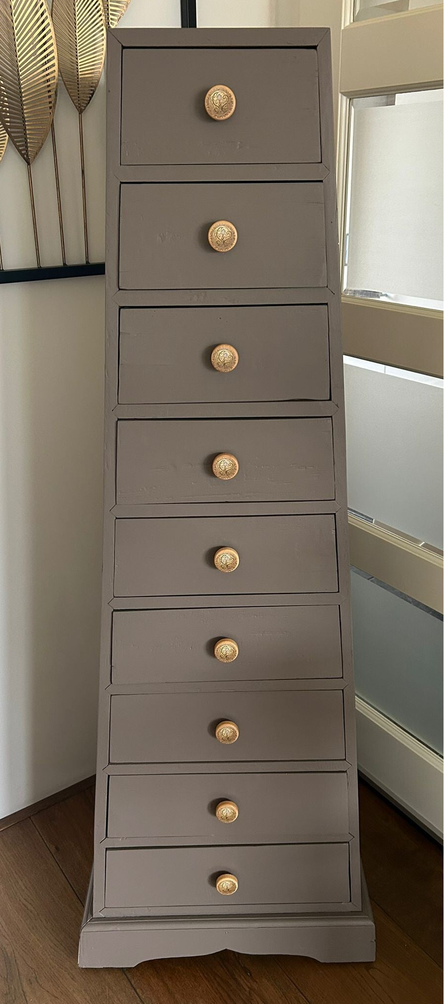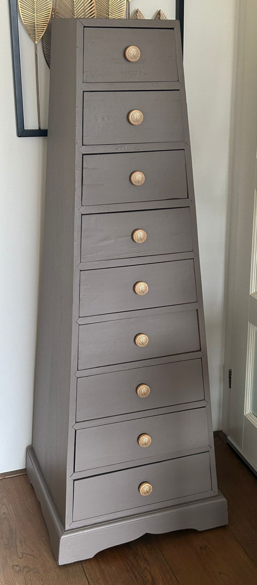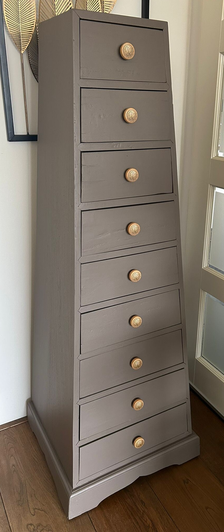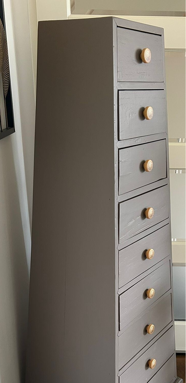 Wat een te gekke kast is dit! Heerlijk wat lades, super toffe vromgeving en echt een solide massief houten kast. De kleur Elmwood van Fusion Mineral Paint is hier toegepast, wat zich goed laat omschrijven als een warm en donkere taupe tint. De kast krijgt hierdoor wat ons betreft nog meer uitstraling. En heb je die leuke bijpassende knoppen gezien, top match toch?!