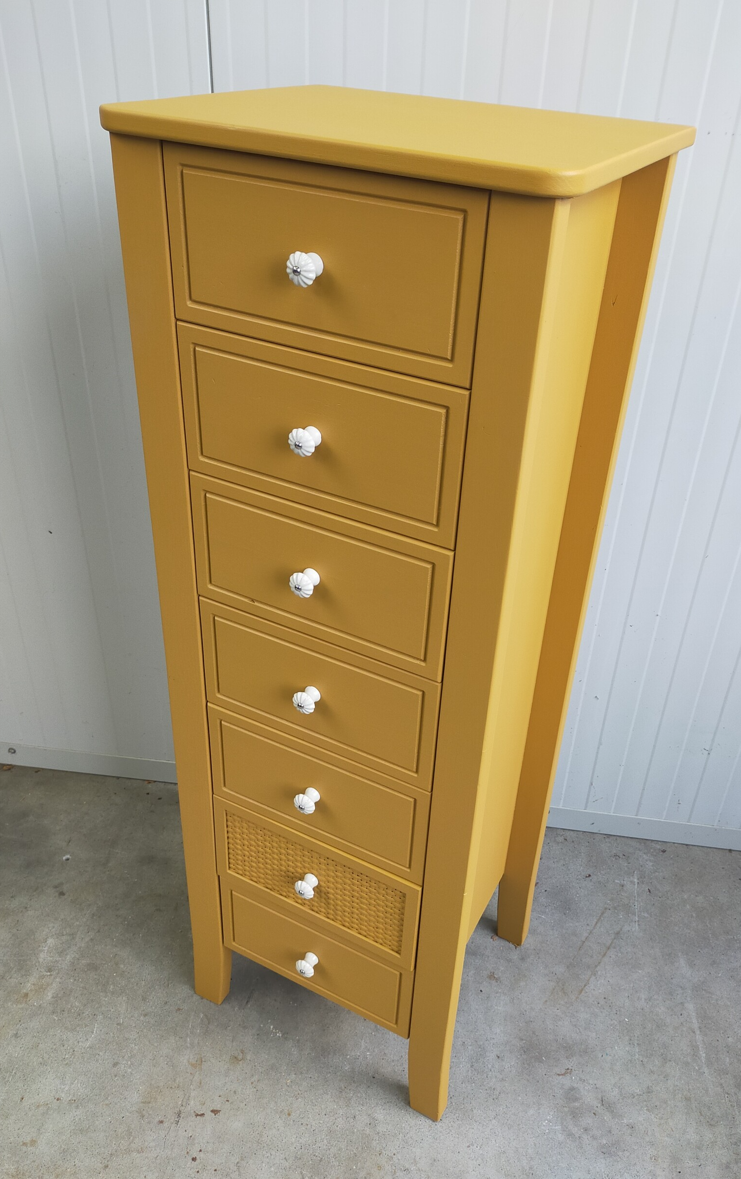 Een mooi rank & slank model deze ladenkast. Een heerlijke gezellige kleur en mooi afgewerkt met porseleinen knopjes. De laadjes lopen lekker soepel en kan een hoop in opgeborgen worden.