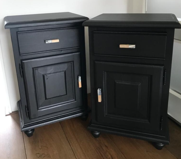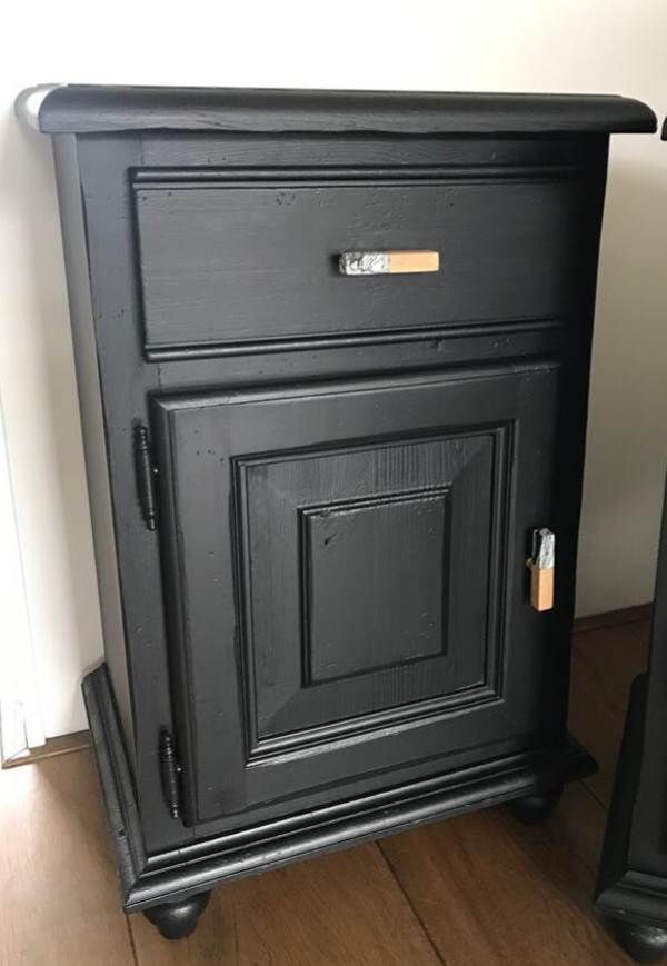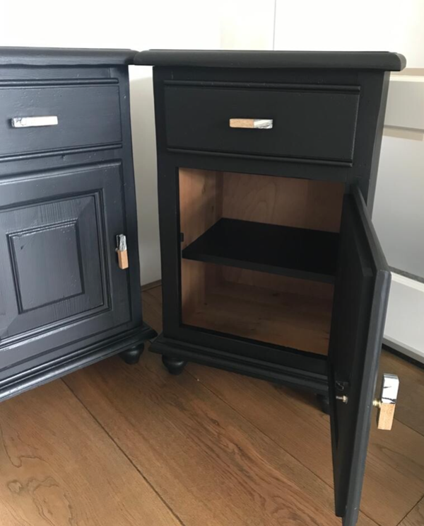 Een mooie set nachtkasjes in een de kleur Coal Black van Fusion Mineral Paint. Prima maatvoering voor bij een boxspring. Achter de deurtjes een plankje en een prettig lopend laadje. Het geheel is afgewerkt met een mooie bijpassende knop.