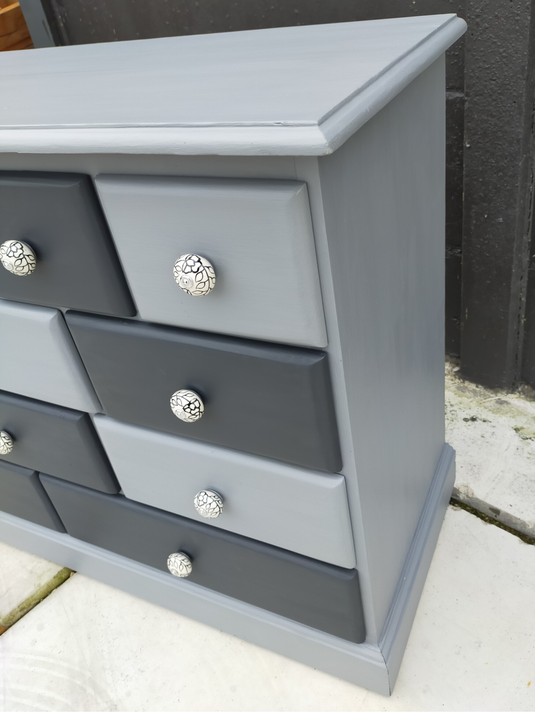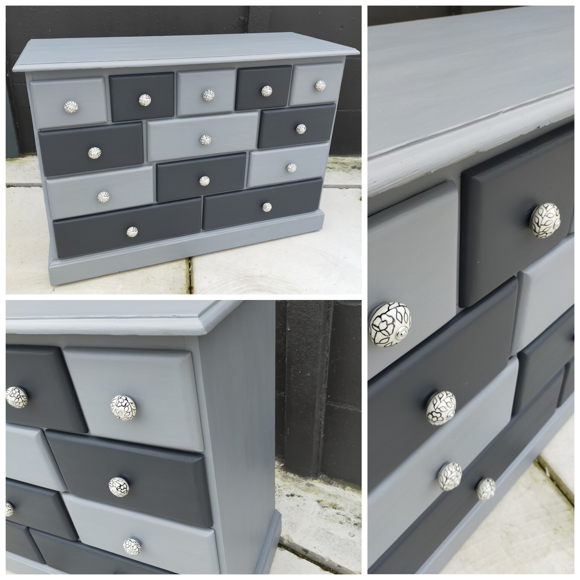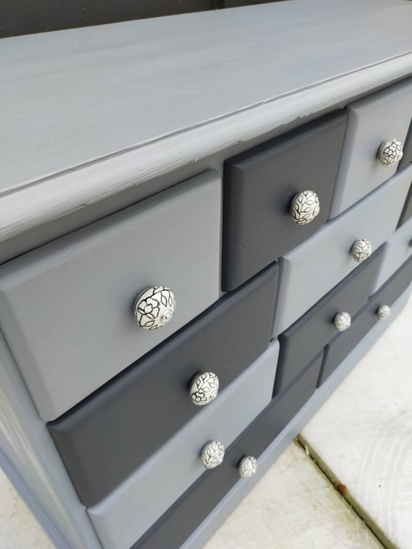 Deze apothekerskast in diverse grijs tinten, past zowel in een modern interieur als een landelijk interieur. Super als dressoir of TV kast te gebruiken, maar in een slaapkamer, keuken of badkamer kan deze knapperd ook goed dienst doen. De lades lopen prima en zijn voorzien van mooie bijpassende porseleinen knoppen