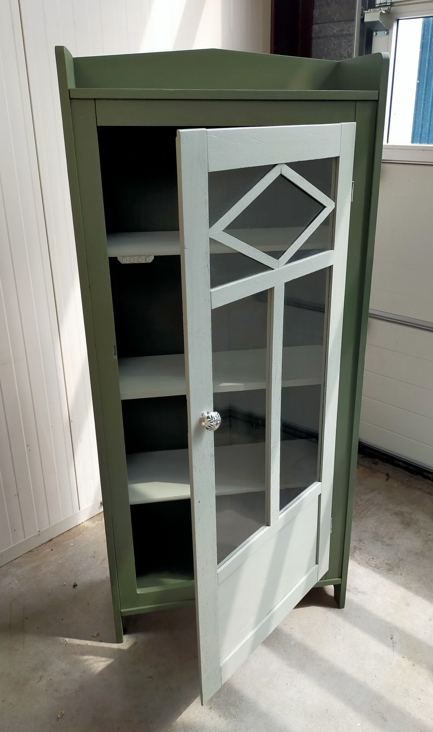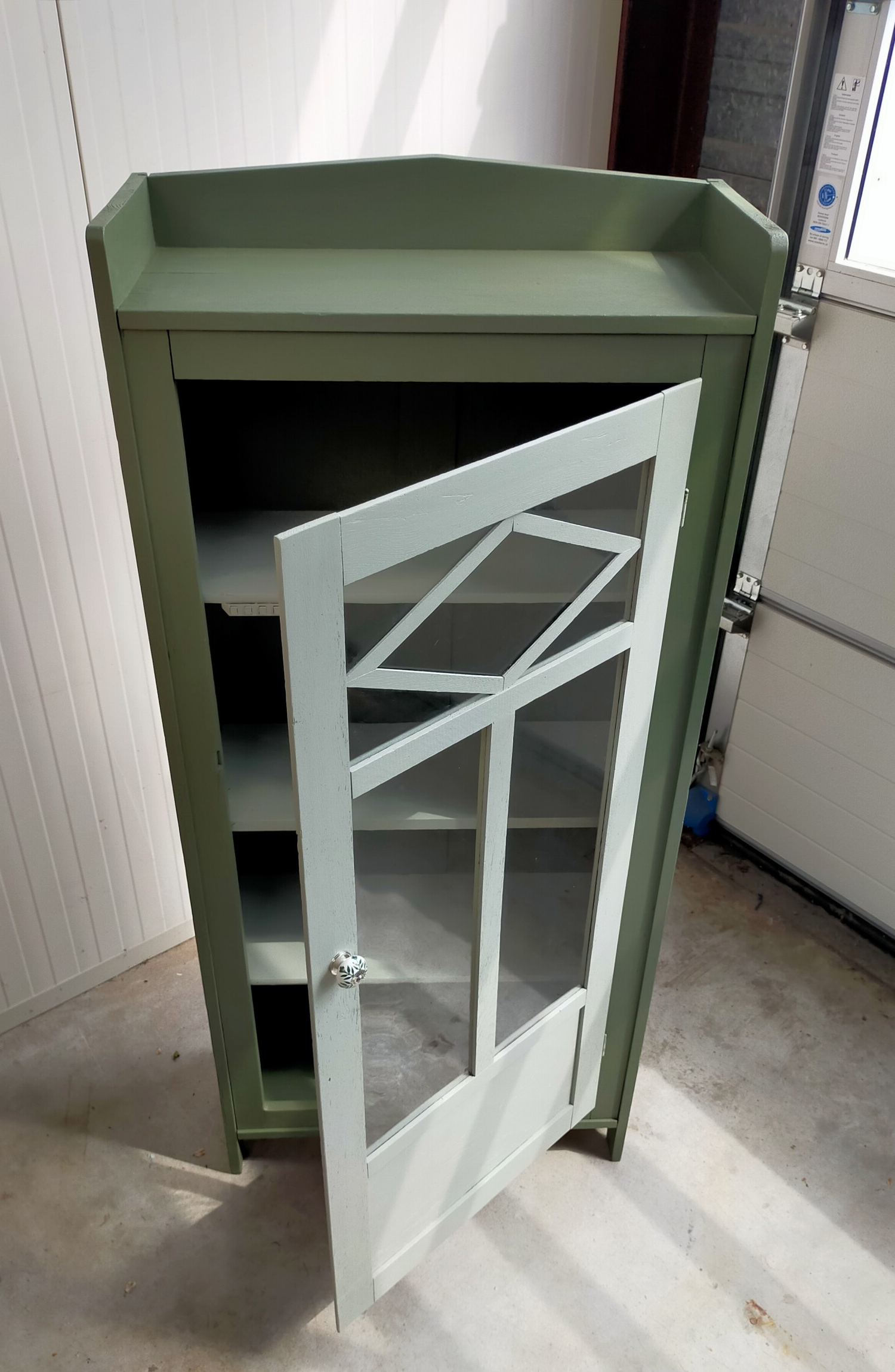 Deze vitrinekast ken toch wel wat hoogte maar is bescheiden qua diepte. Mooie details in/op de deur en voorzien van nog het echte "oude" orginele glas. Door 2 tinten te combineren zowel aan de binnenzijde als aan de buitenzijde geeft dit het kastje net even een ander gevoel en uiterlijk. Maw....net even anders dan anders. Uiteraard mag de bijpassende porseleinen knop niet ontbreken.