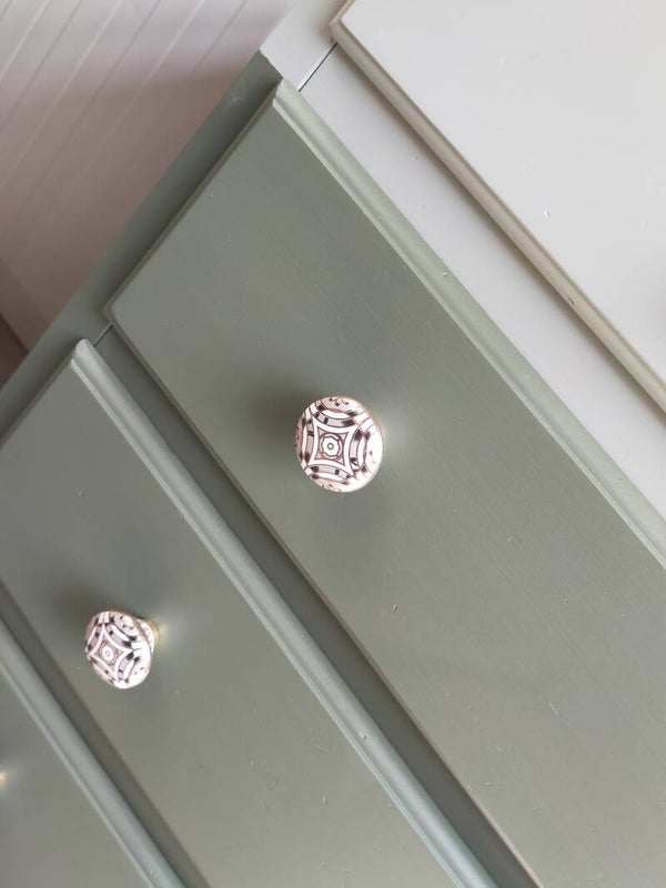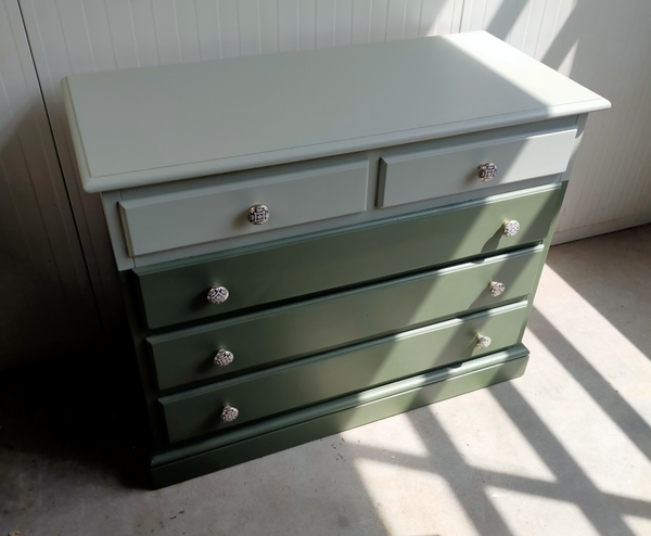 Deze woest stevige en degelijke ladenkast staat in 2 mooie bij elkaar passende kleuren. Bayberry en Bellwood van Fusion Mineral Paint. De kast kent een mooi strak uiterlijk, maar doet warm aan door zijn kleuren combinatie en de unieke porseleinen knoppen. De lades lopen uitstekend en zo is er weer jaren plezier aan te beleven.
