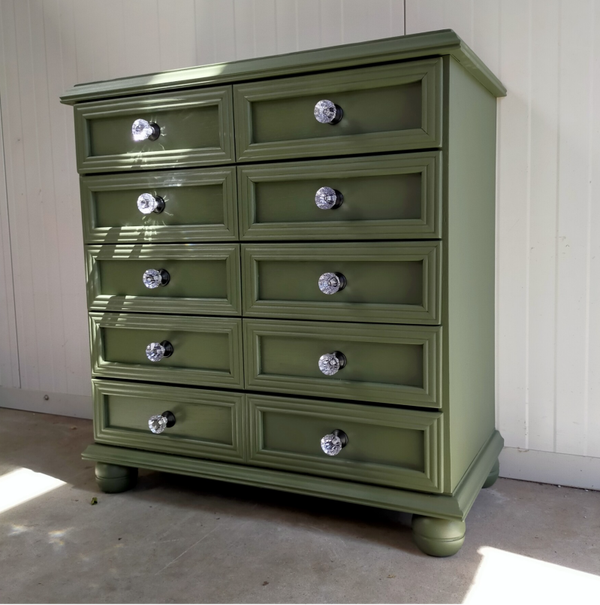 Leuk en praktisch model ladenkastje. In een mooie warme olijf groene kleur wat prettig werkt met de glazen knopjes. De 5 grote lades lopen soepel en geven de mogelijkheid om lekker veel in op te bergen.