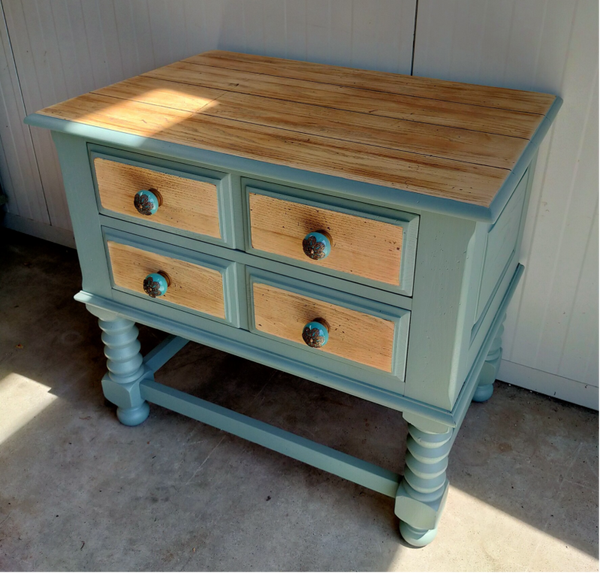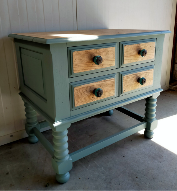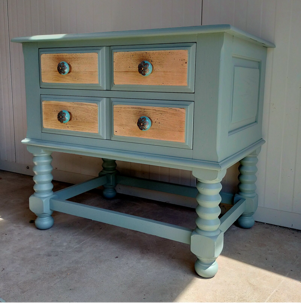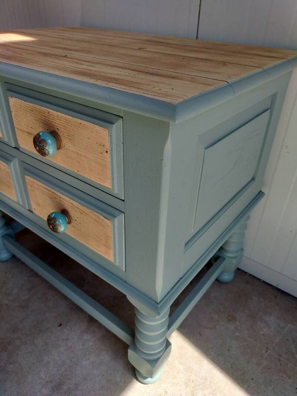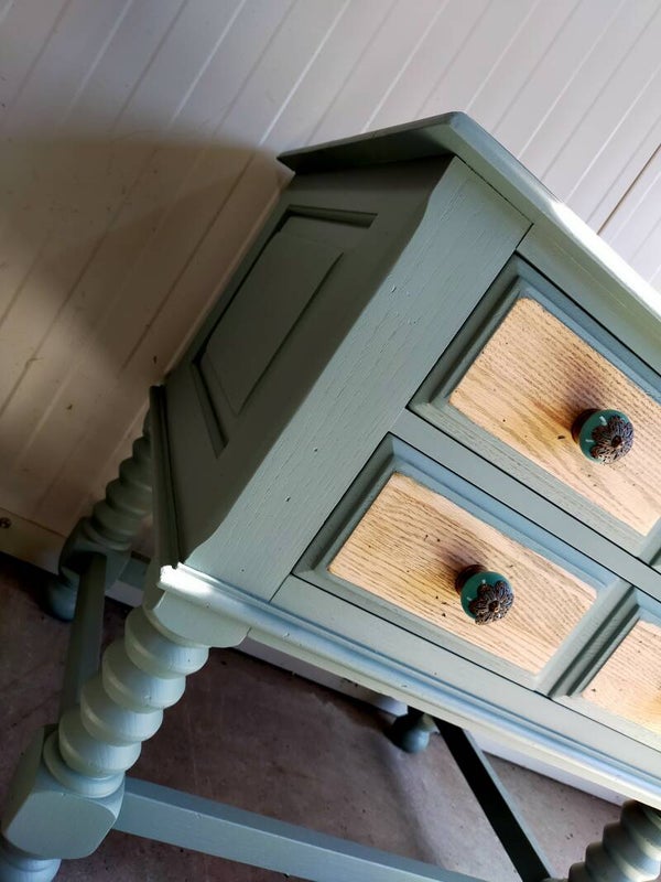 Het mooie natuurlijke hout met de custom mix kleur, zijn mooie gedraaide poten en bijpassende porseleinen knoppen maken dit een mooi en uniek kastje.