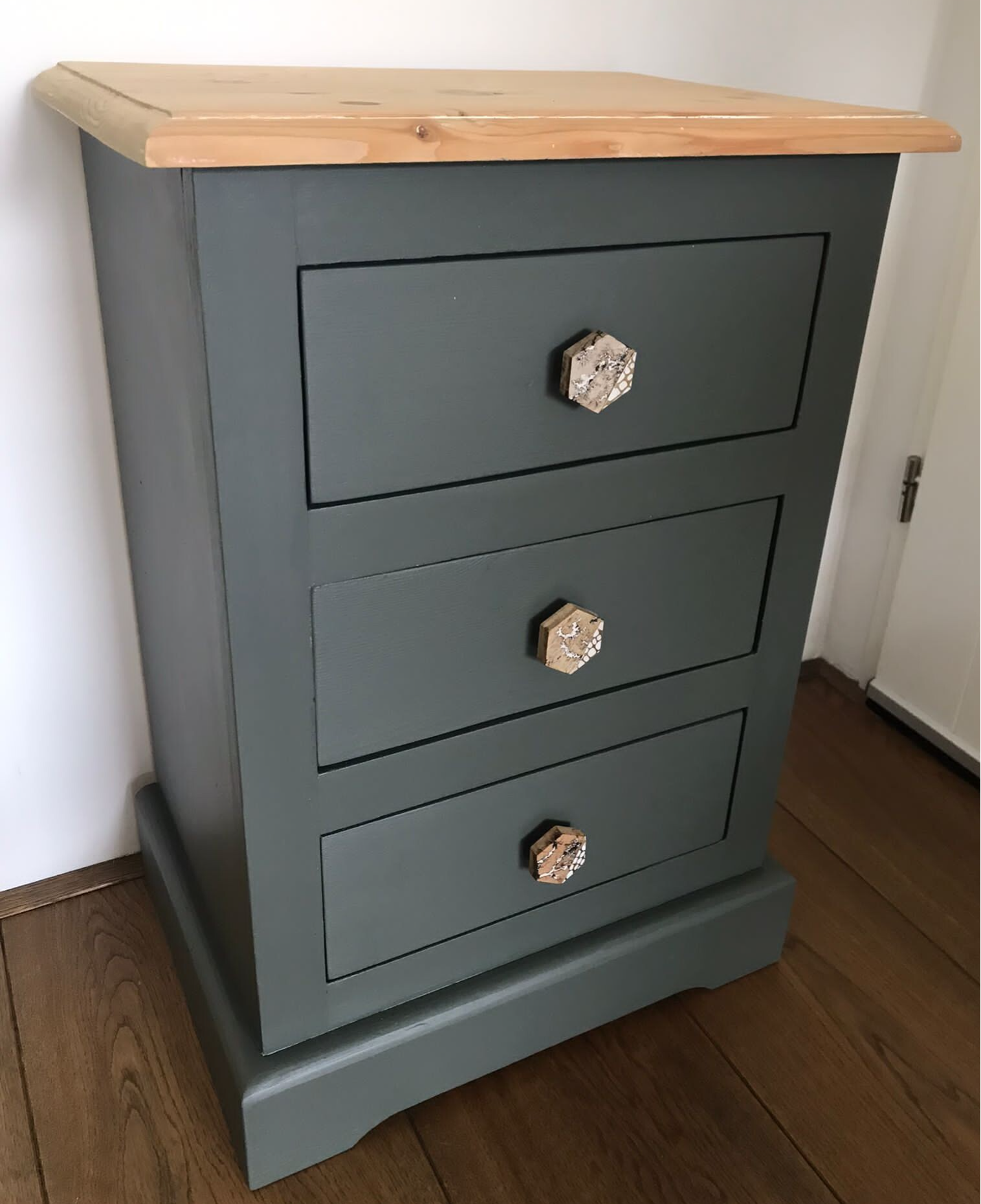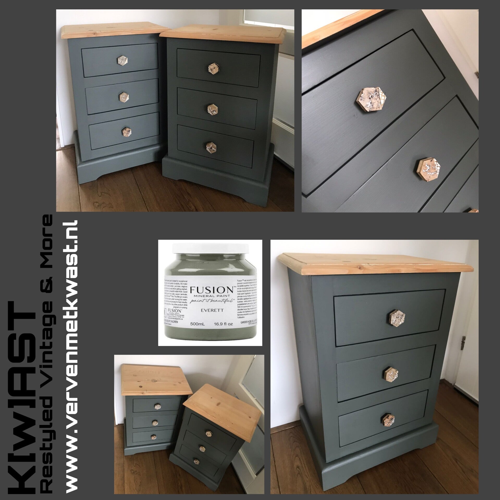 Voor deze set nachtkastjes is de kleur Everett van Fusion Mineral Paint gebruikt. Deze kleur kenmerkt zich door zijn intensiteit. De uitstraling kent een donkergroen kleur maar met een duidelijke aanwezigheid van ee donkergrijze ondertoon. Dit in combinatie met het natuurlijke bovenblad en de bijpassende knoppen maakt het tot een tof geheel.