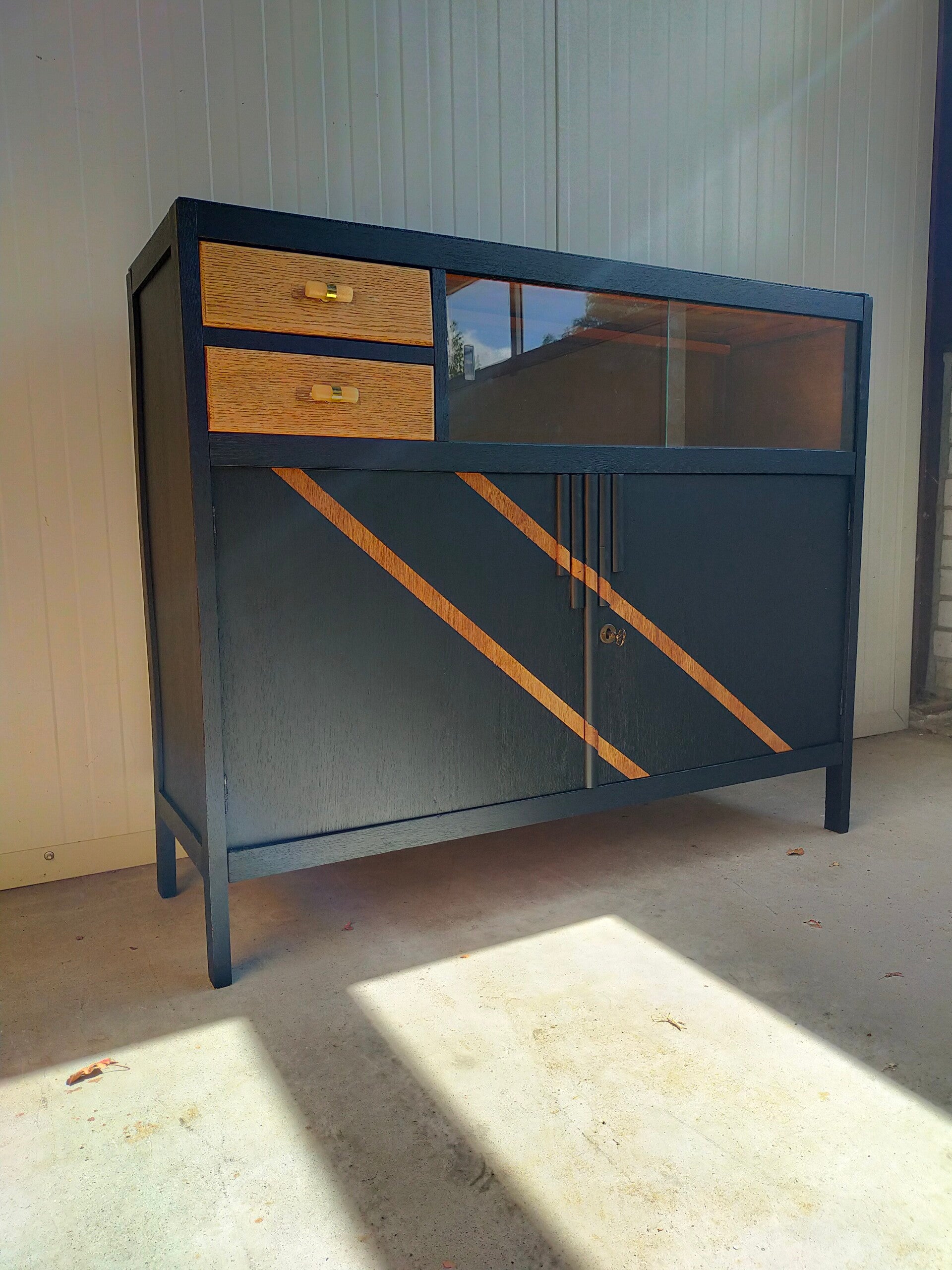 Een artdeco look en uitstraling, maar dan helemaal in het nu! Dat zijn de woorden die bij ons opkomen als wij naar dit dressoir kijken. Mooie oude details, verfijnd hout, gaaf glas als vitrine deurtjes, orgineel beslag, eigentijdse knoppen en een mooi diep mat zwarte kleur van Fusion Mineral Paint. En achter de deurtjes ook nog een plank over de gehele breedte, dus aan opbergruimte geen gebrek!