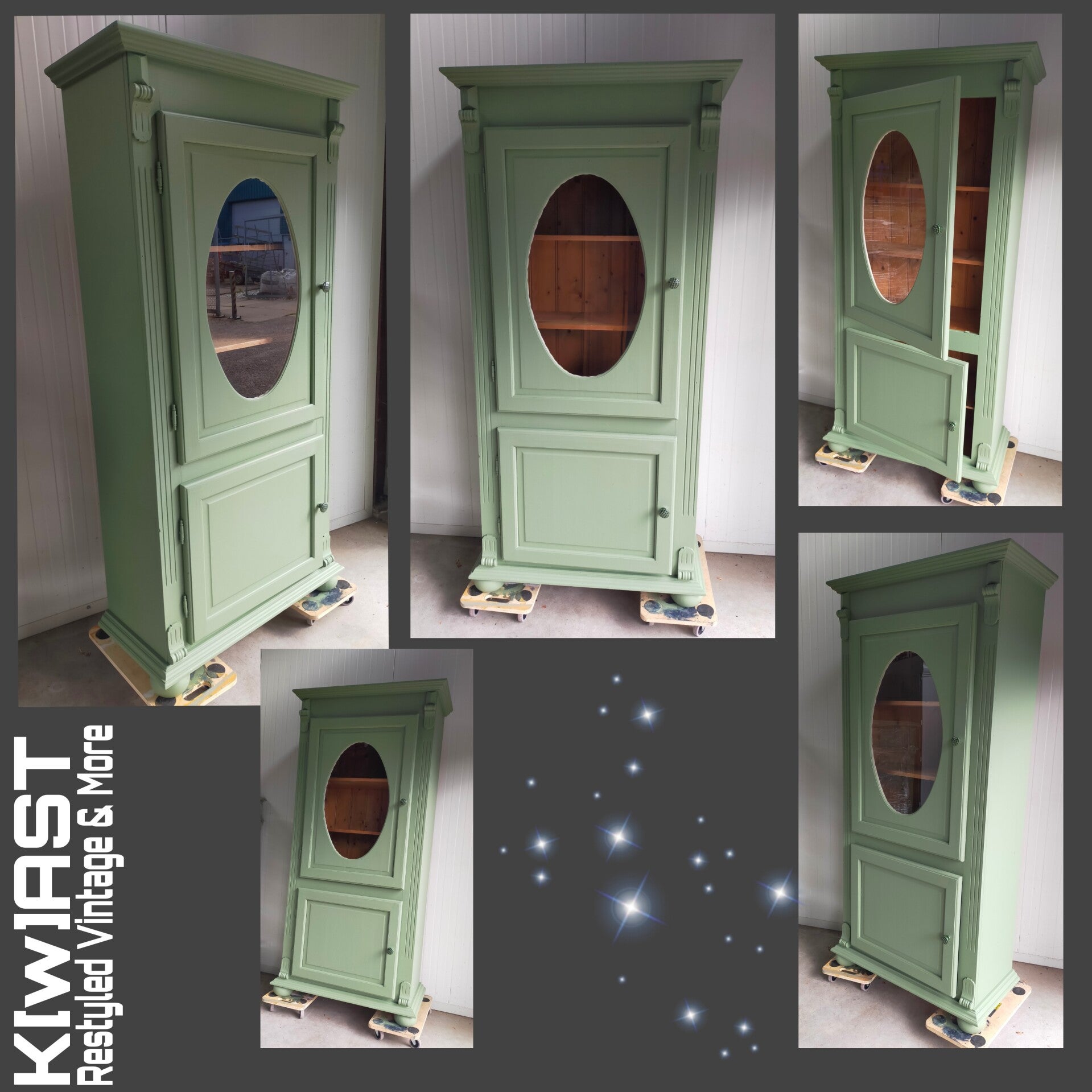 Deze vitrinekast kenmerkt zicht door zijn aparte vormgeving. Dit wordt benadrukt door het ovale glas en de verdere mooie strakke belijning. Achter de 2 afzonderlijke deurtjes geven een berg aan opbergruimte. Deze kast staat geheel nieuw in de verf en is in de waanzinnig mooie nieuwe kleur Conservatory van Fusion Mineral Paint gezet. Uiteraard zijn er bijpassende porseleinen knoppen op de deurtjes geplaats.