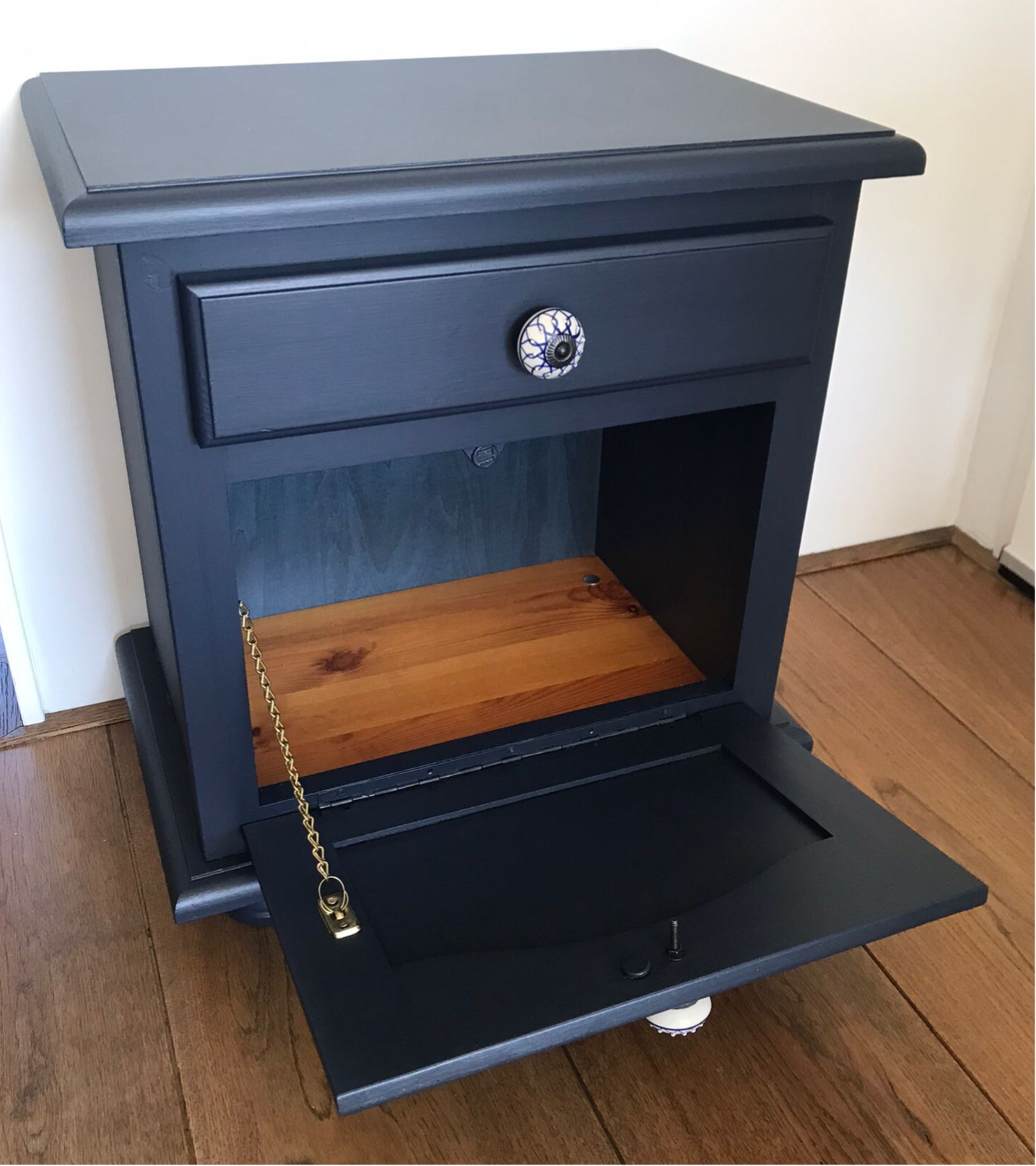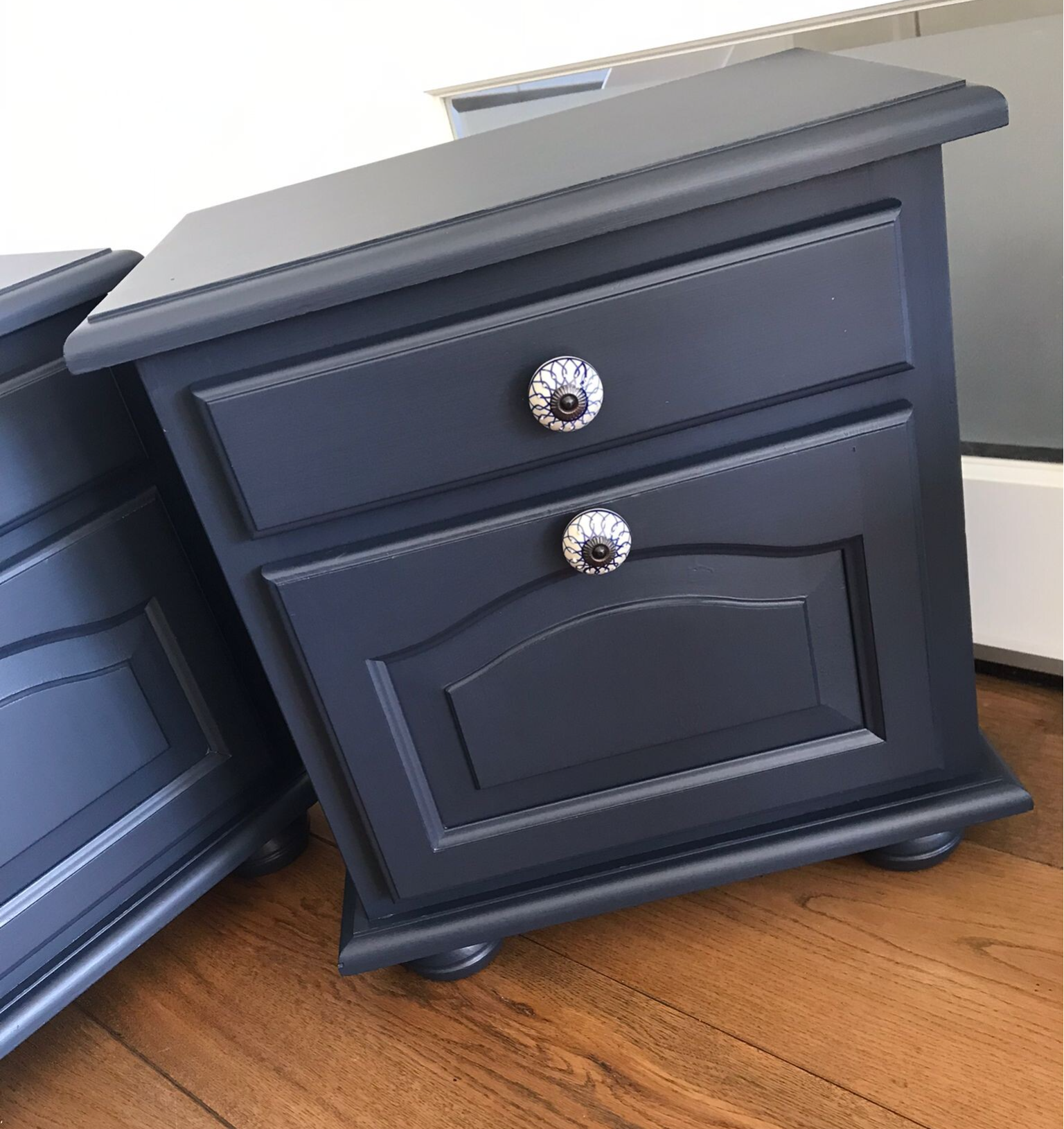Een prachtige set deze nachtkastjes in de diep blauwe kleur, Midnight Blue van Fusion Mineral Paint. En het leuke van deze kastjes zijn dat ze naast een laadje ook een klep deurtje hebben, net even anders als anders! In combinatie met de mooie bijpassende porseleinen knoppen, maakt dit deze set een chic geheel.