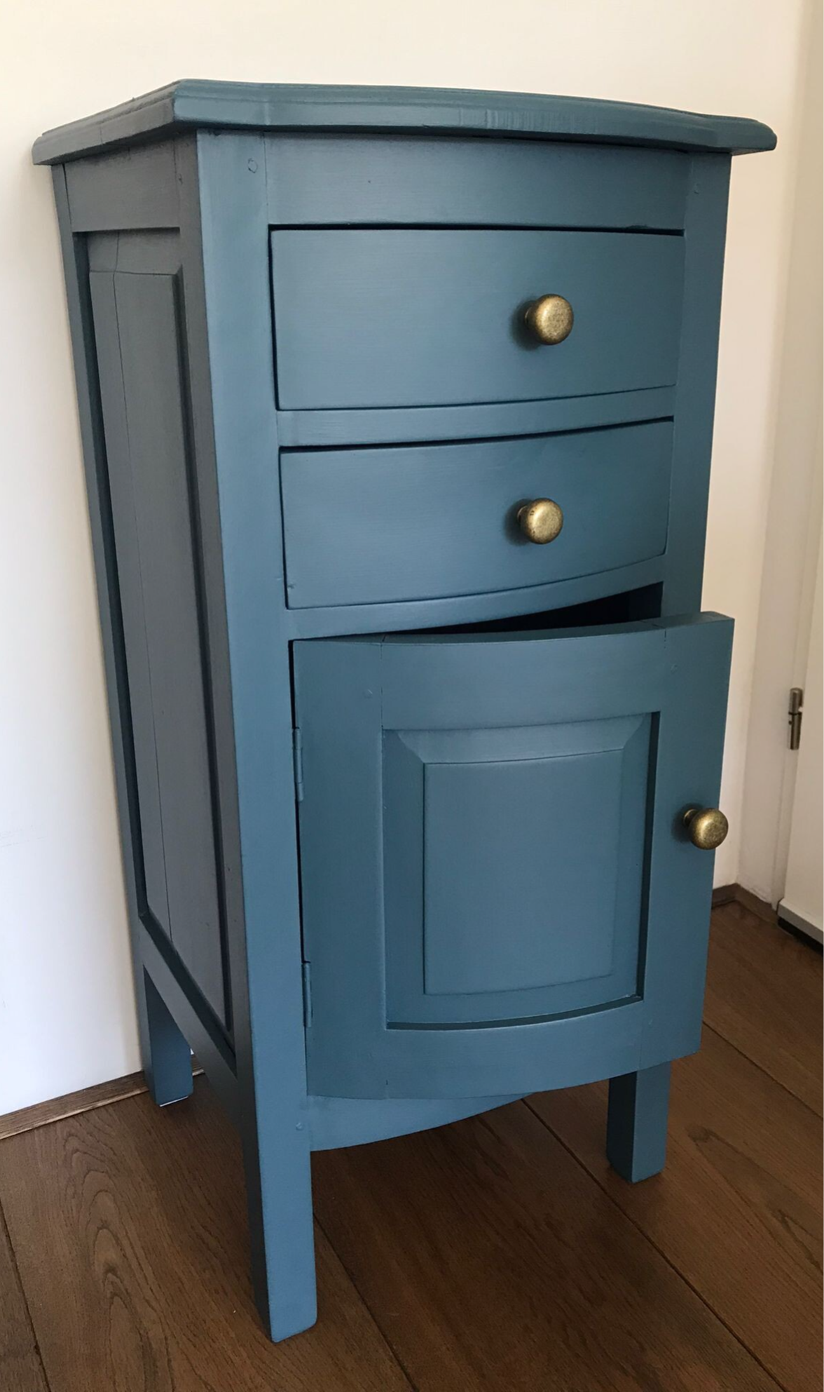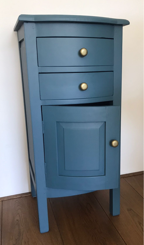Een leuk en bescheiden (qua afmetingen) kastje met zowel een 2 tal lades als een deurtje. Dit kastje staat in een de mooie petrolachtige kleur blauw van Fusion Mineral Paint. Het kastje is afgewerkt met oud orgineel beslag. Uiteraard is dit kastje voor vele doeleinden geschikt, zoals in de hal, in een verloren hoekje in de woonkamer of wat dacht je van een leuk plekje in de badkamer met een mooie plant er op?!