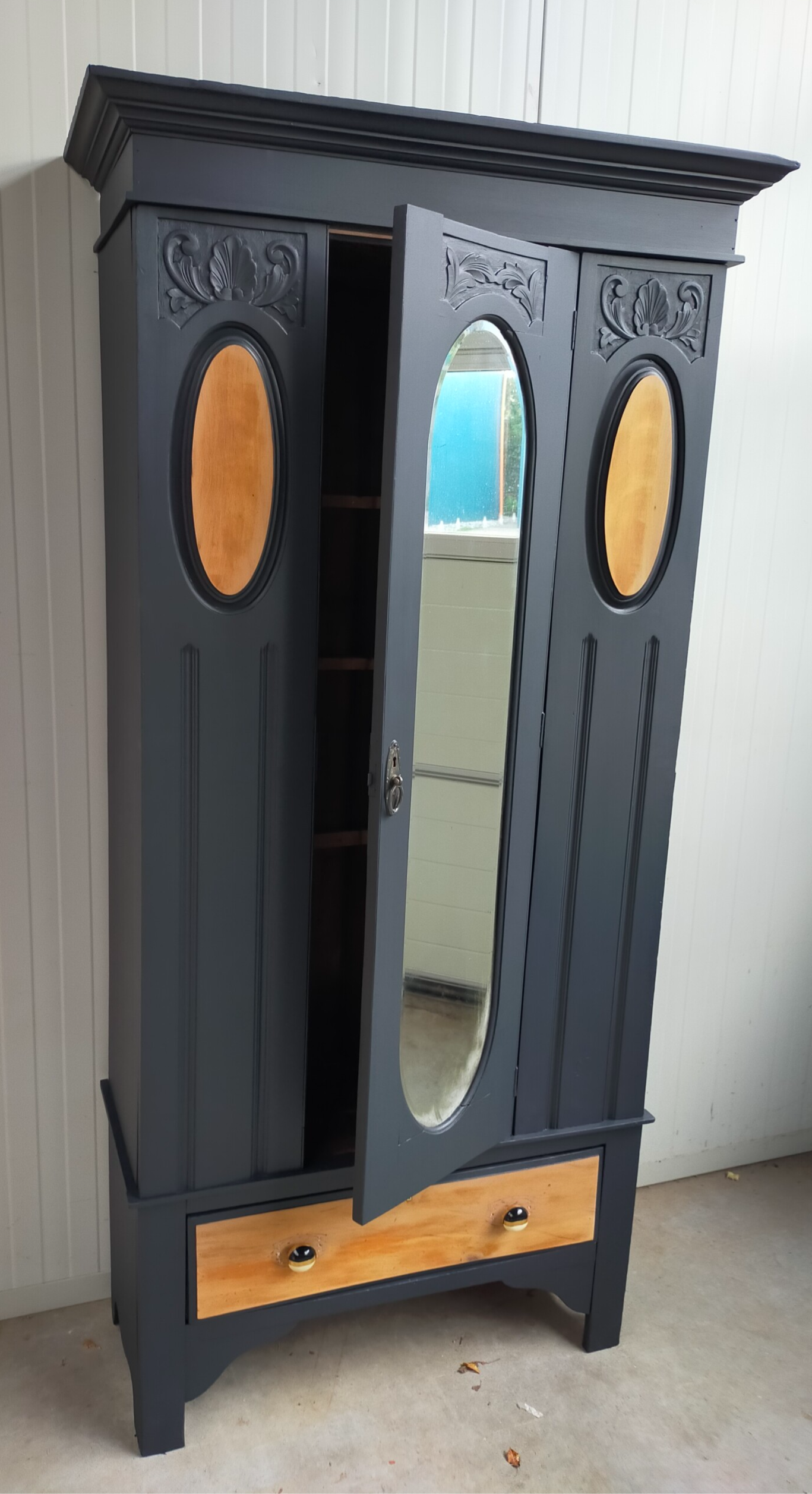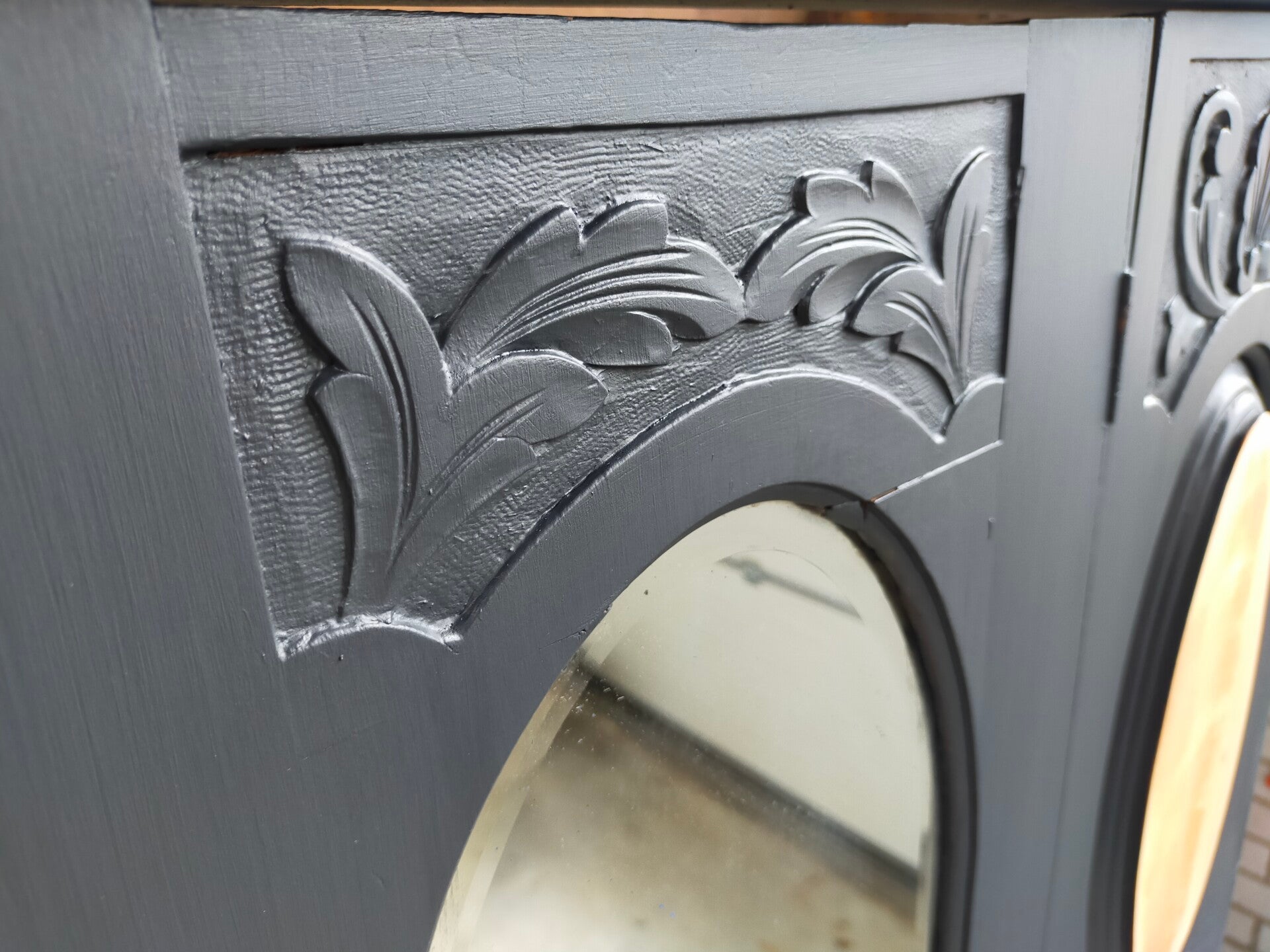 Een bijzondere oude dame, deze linnenkast! Maar neemt niet weg, dat ze nu weer helemaal up to date is. De kleur Ash van Fusion Mineral Paint is hier gebruikt, wat goed samen gaat met de orginele hout accenten. De kast kent mooi en autenthiek houtsnijwerk en een een prachtige spiegel. Verder is er een combinatie gemaakt met oud en nieuw beslag, wat goed samen gaat op deze kast.