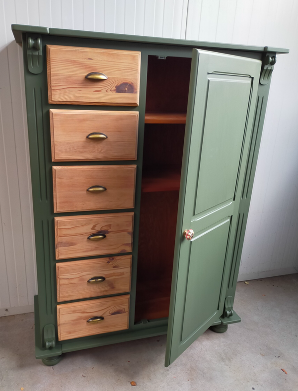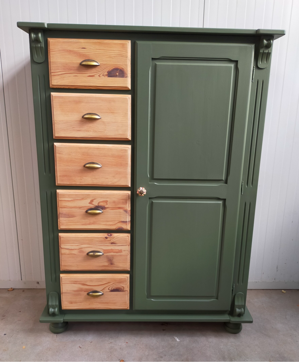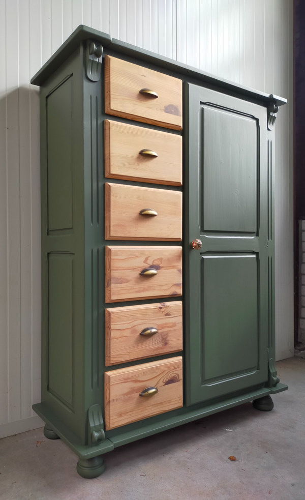 Een prachtige en zeer stevige spekkast in de mooie kleur Bayberry van Fusion Mineral Paint. De lades in hun natuurlijke hout kleur in combinatie met authentieke messing komgrepen. Op de deur een eigentijdse porseleinen knop met achter de deur planken en een hangstang. Kortom....heel veel mogelijkheden met en voor deze kast.