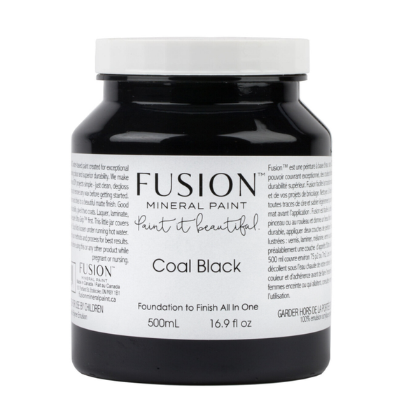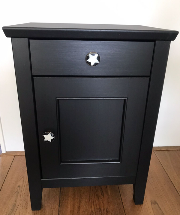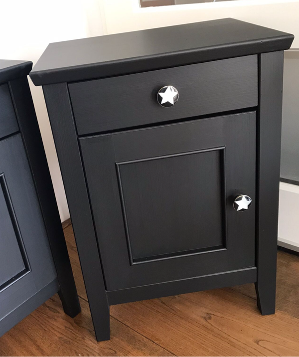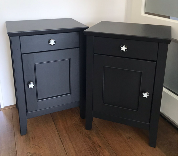 Dit setje nachtkastjes staat in de diep zwarte kleur Coal Black van Fusion Mineral Paint en dit in combinatie met de verfijnde bijpassende knopjes maakt het tot een chic geheel.