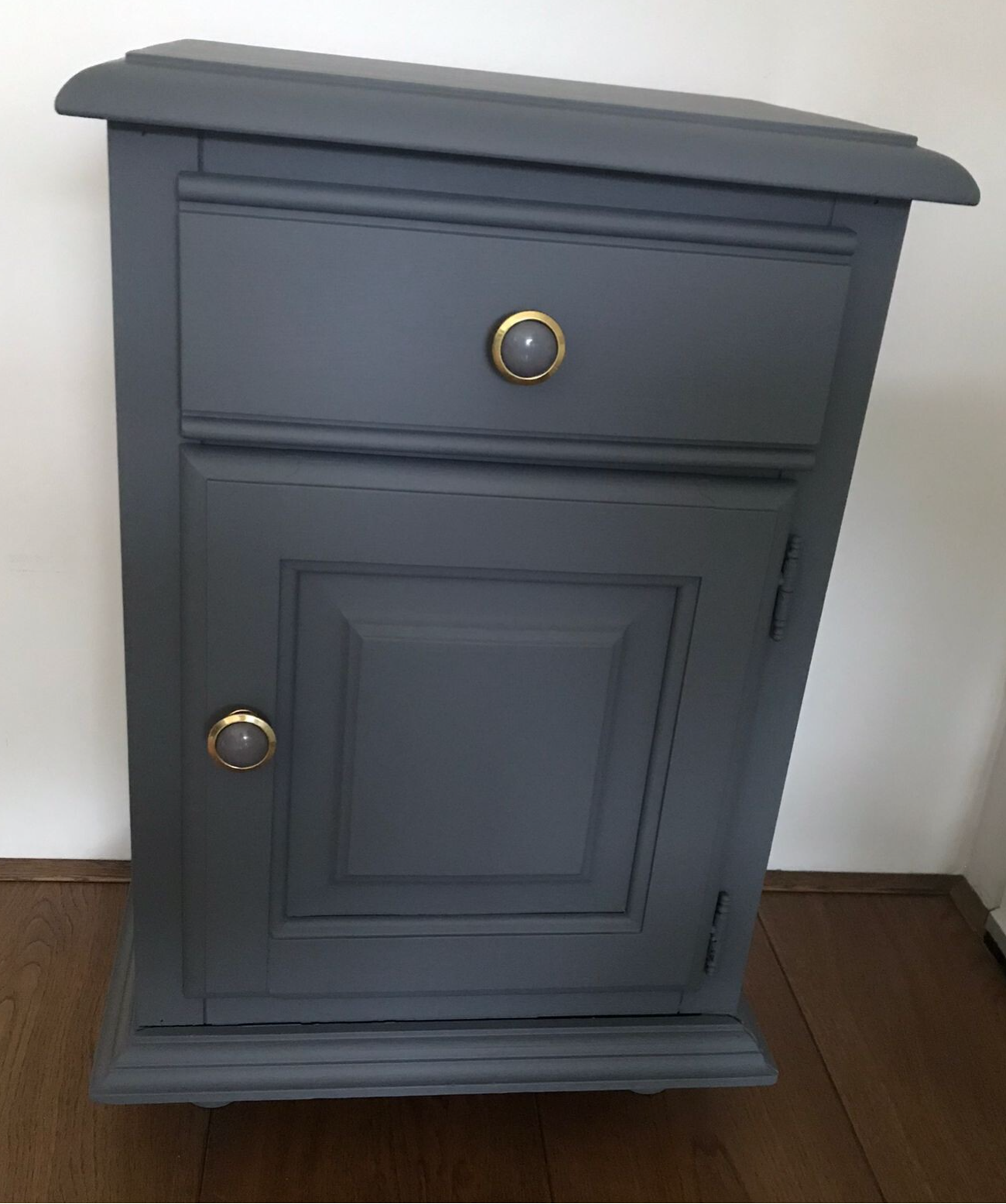 Prachtig en stevig set nachtkastjes. Deze hebben de mooie en diepe kleur grijs, SoapStone, van Fusion Mineral Paint. De deurtjes en laadjes zijn afgewerkt met een bijpassende knop. Ook een prima set voor naast een stoere boxspring.
