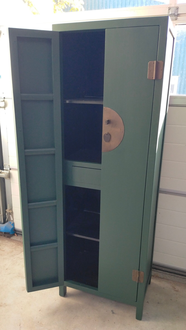 Een zeer prettig model orginele oude chinese kast. Bescheiden afmetingen, orgineel beslag, maar dan in een "ander" jasje! De kleur Manor Green van Fusion Mineral Paint is echt een zeer mooie diep groene kleur, wat in combinatie met een messing beslag echt super tot zijn recht komt. In de kast diverse leg planken en ook nog een lade.