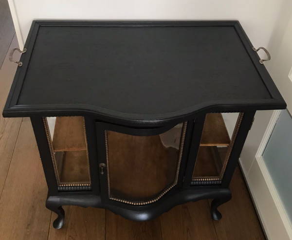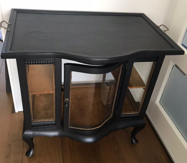 Deze oude dame is gezien haar leeftijd nog in top conditie. Het glas rondom is nog in uitstekende staat en betreft allen ook nog echt 'oud' glas. De sierlijke lijnen, het mooie bol glas, het afneembare dienblad en her en der wat mooie natuurlijke houttinten, maken dit tot een uniek exemplaar. Ze staat in de diep zwarte kleur Coal Black van Fusion Mineral Paint, wat haar in combinatie met de details en het orginele beslag een chique uitstraling geeft.