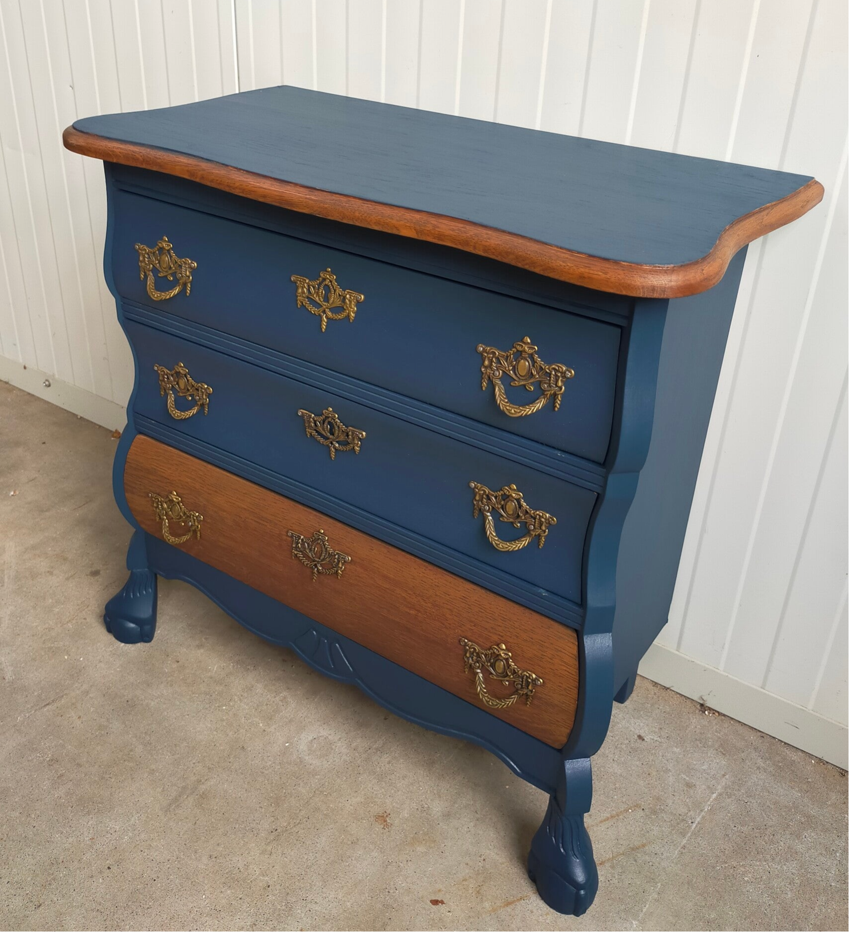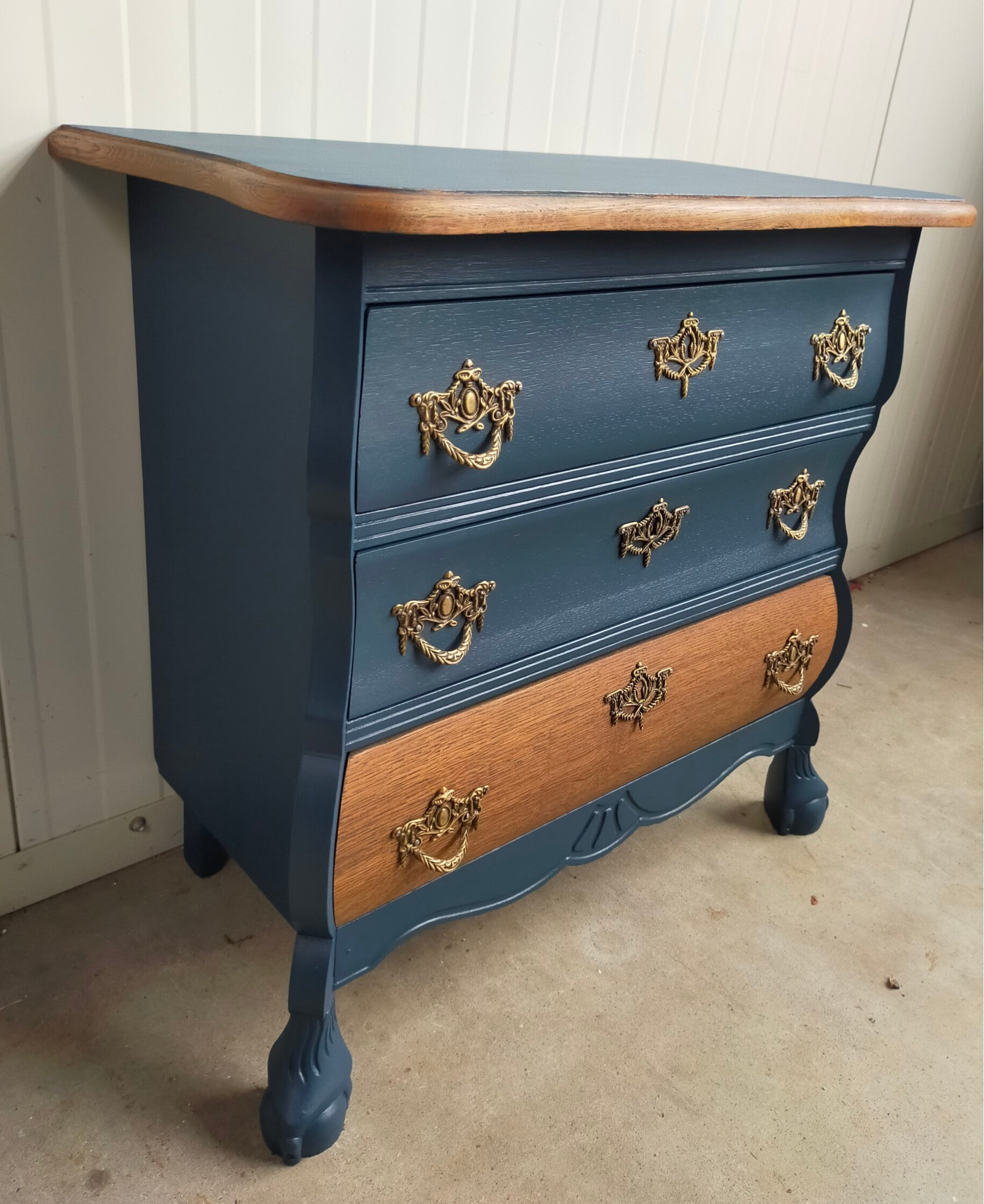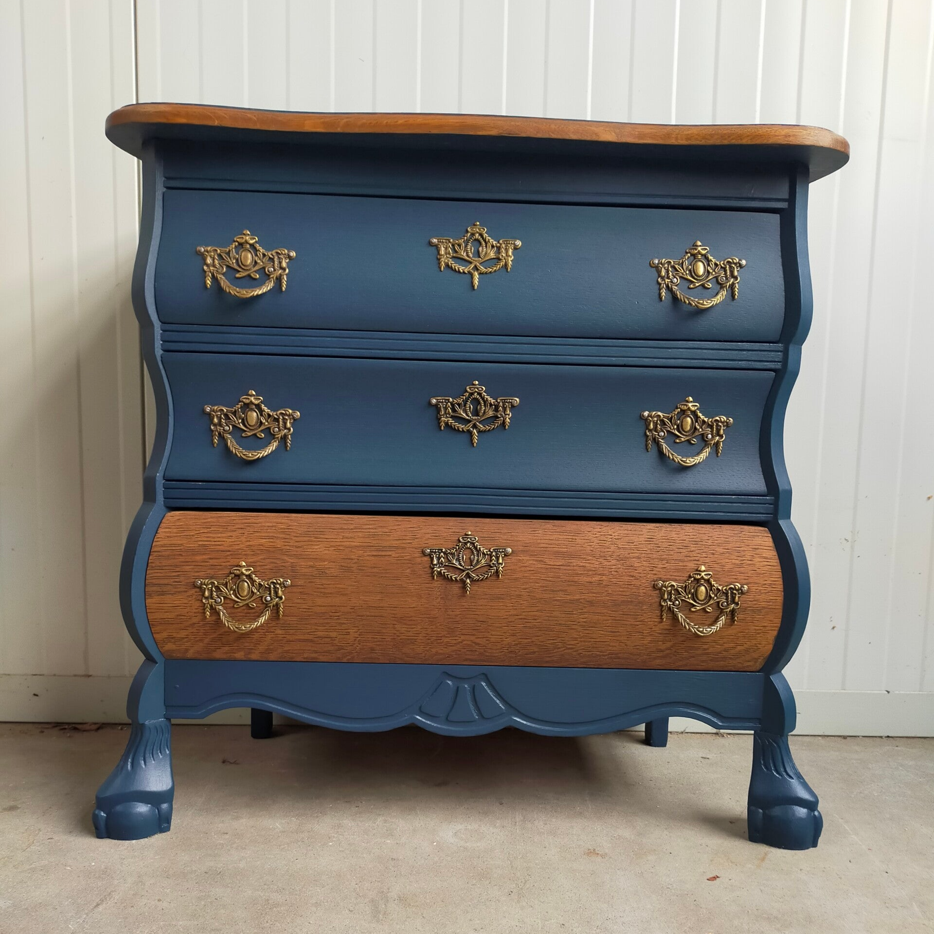 Dit super leuke buikkastje komt rechtstreeks uit de jaren 60 a 70! Een heerlijk formaatje waardoor er al snel plek is voor hem. De kleur Willowbank van Fusion Mineral Paint is een mooi intens blauwe tint. Wat vervolgens weer erg goed werkt met het orginele beslag en de hout details. Het hout is overigens afgwerkt met een matte cappuccino finish, wat het hout beschermt en ter gelijketijd een mooie uitstraling geeft.