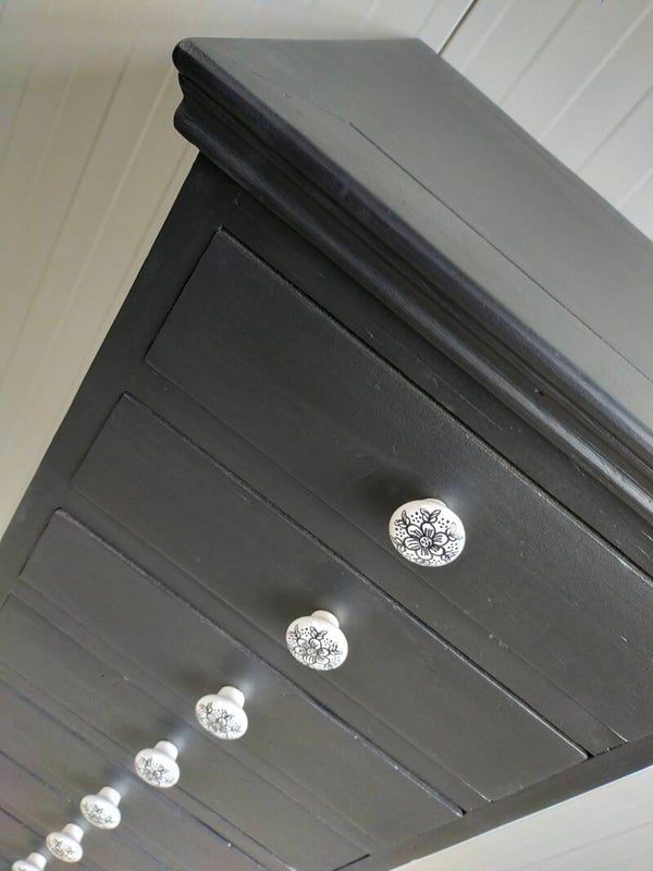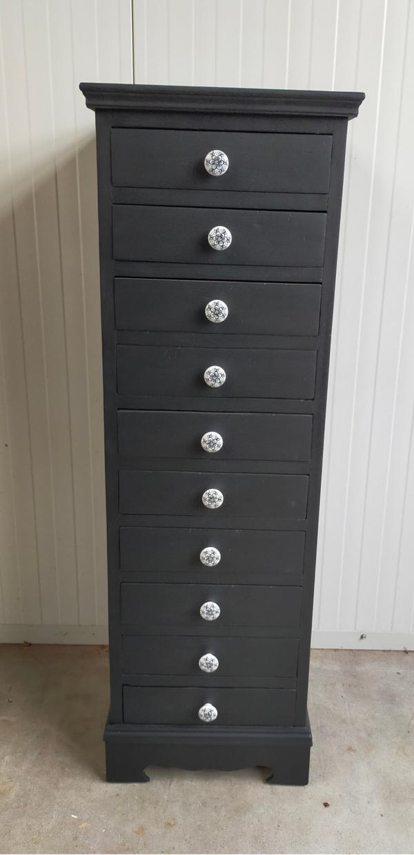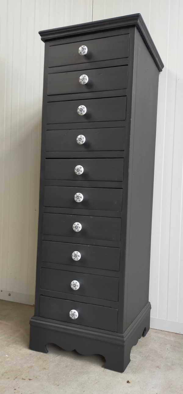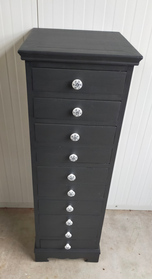 Een mooi formaat heeft deze zogenaamde apothekerskast. Niet zo breed, maar wel lekker wat hoogte en waanzinnig veel laadjes. Deze kast staat in de kleur Coal Black van Fusion Mineral Paint, die zich laat kenmerken door zijn intense zwarte tint. De lades zijn voorzien van bijpassende porseleinen knoppen. De kast is vervaardigd uit grenen hout en de lades lopen & sluiten goed.