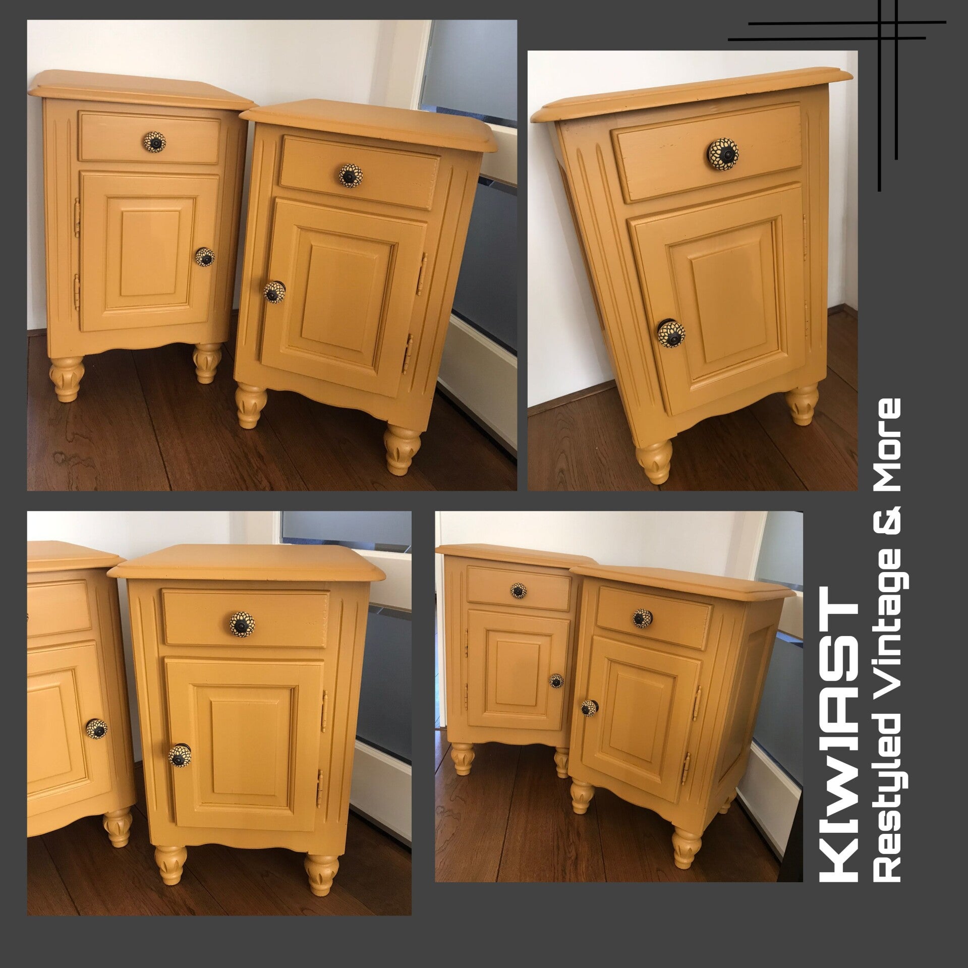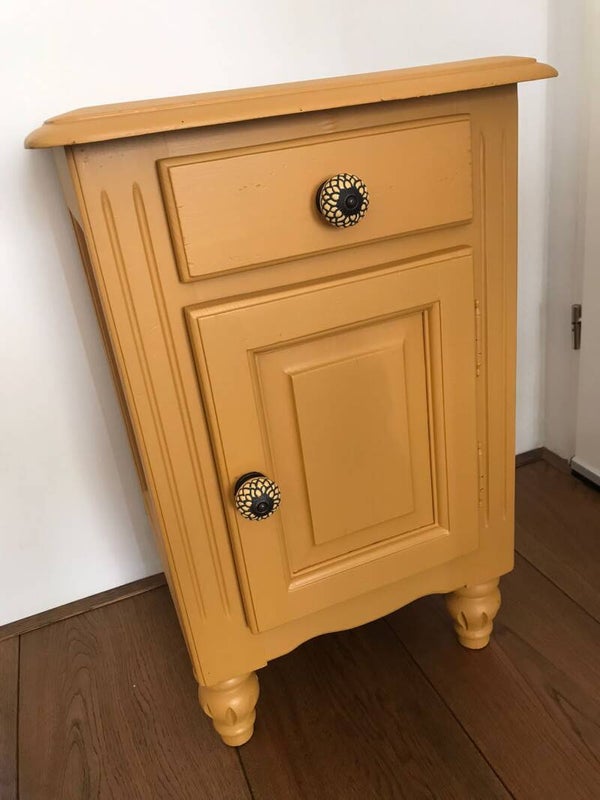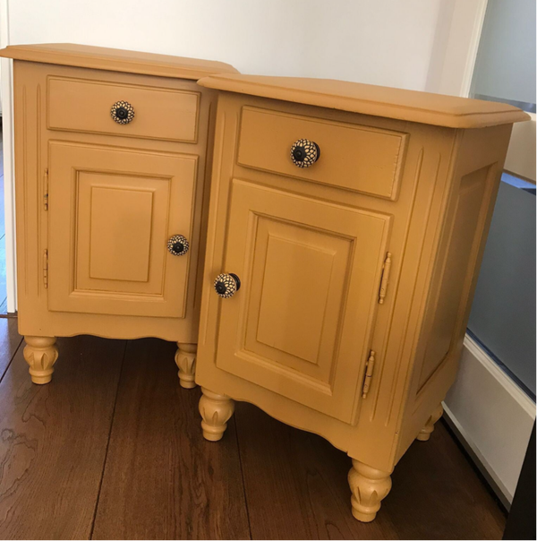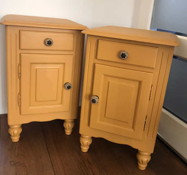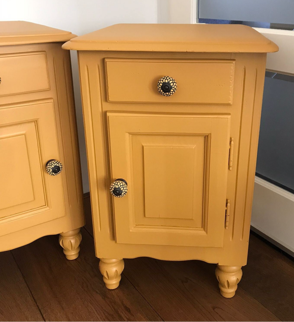 De kleur Mustard van Fusion Mineral Paint laat zich het best omschrijven als oker geel. Deze warme gele tint straalt tevens een dosis lef uit. Deze set nachtkastjes staan dan ook garant voor net even wat anders dan standaard. Mede door de kleur, maar ook zeker door de details in het houtsnijwerk, sierlijke pootjes en de toffe porseleinen knoppen.
