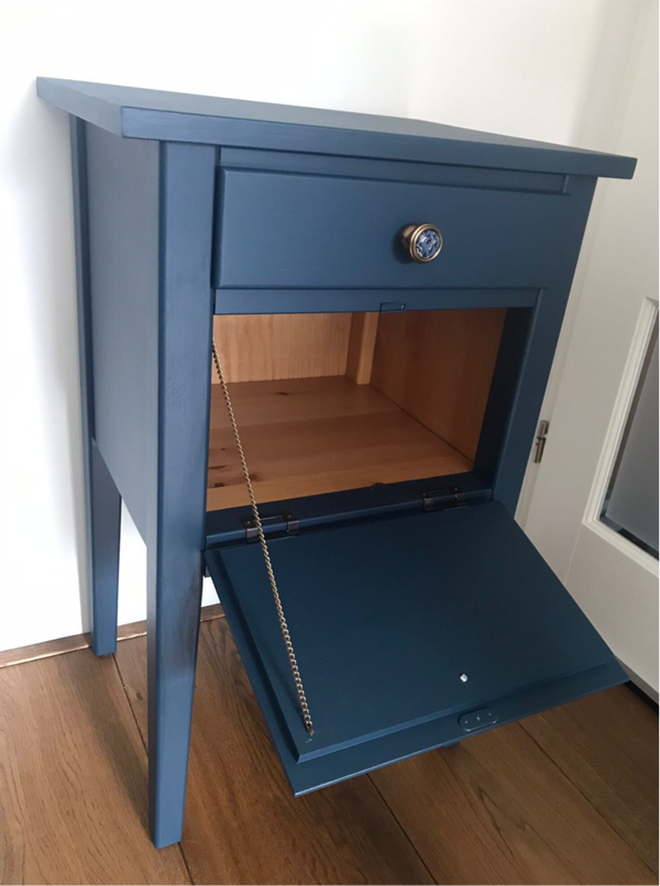 Klepkastje met lade in de mooie diep blauwe kleur Willowbank van Fusion Mineral Paint. En hoe goed passen deze te gekke knopjes hierbij?!