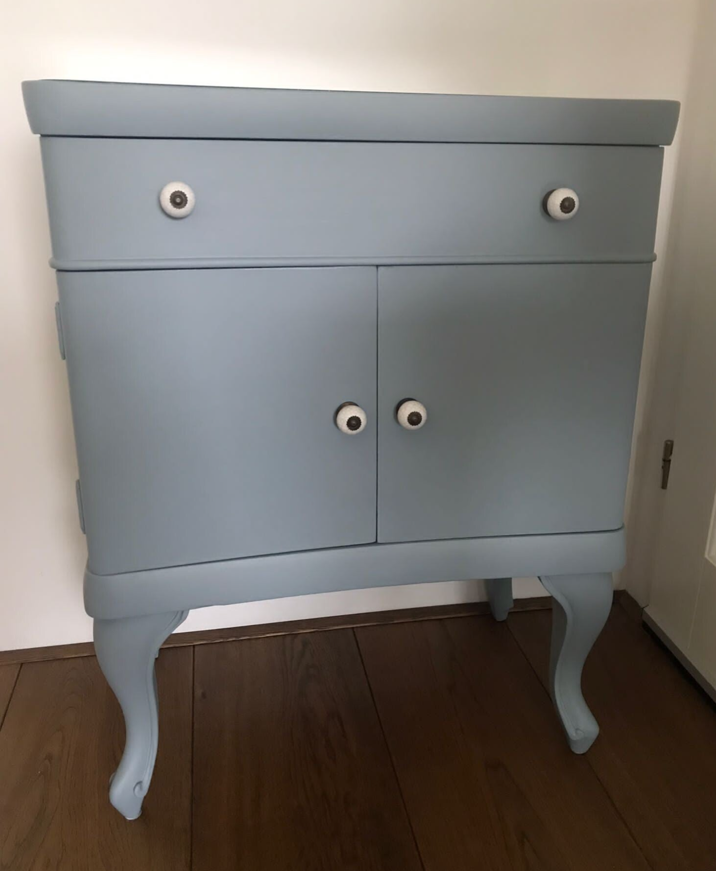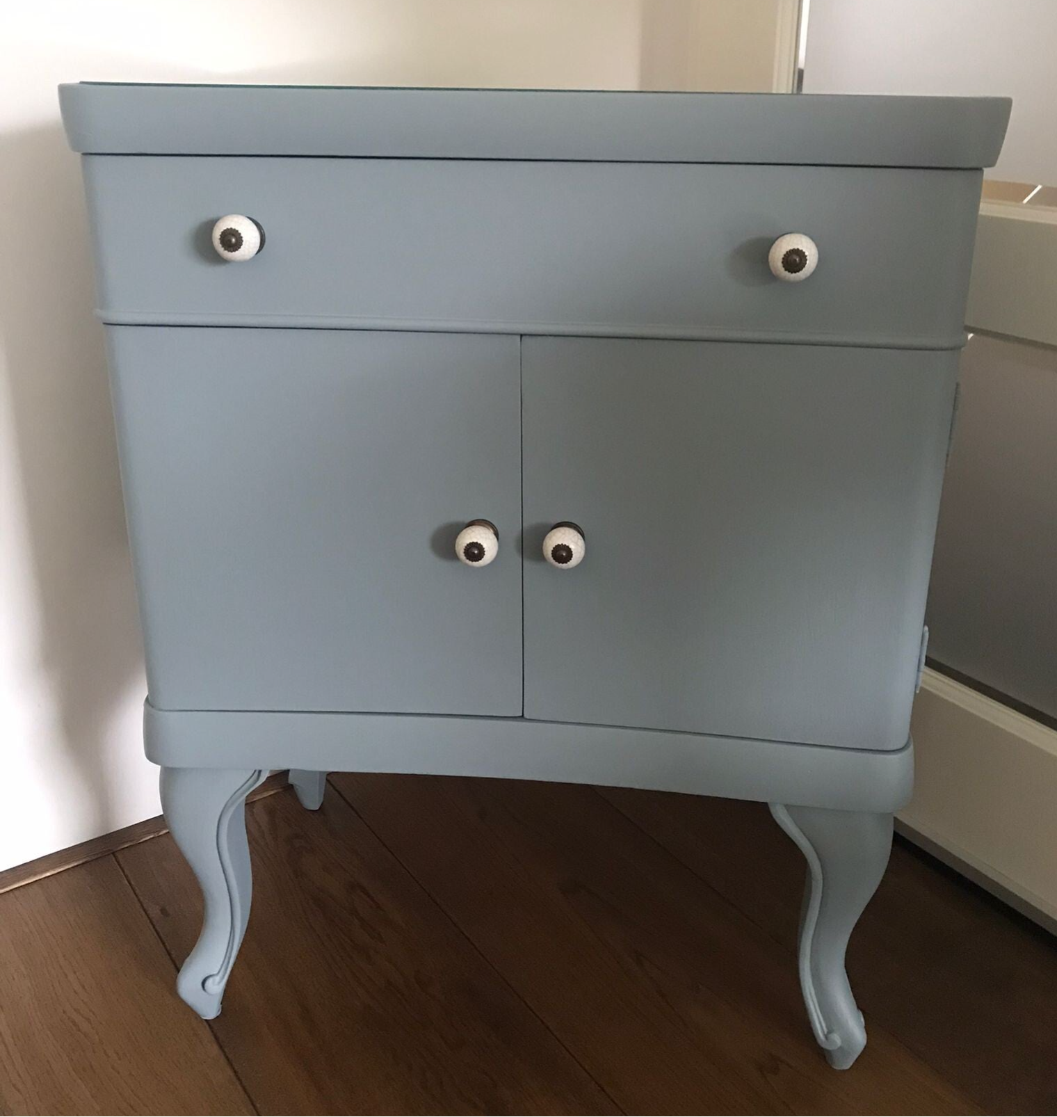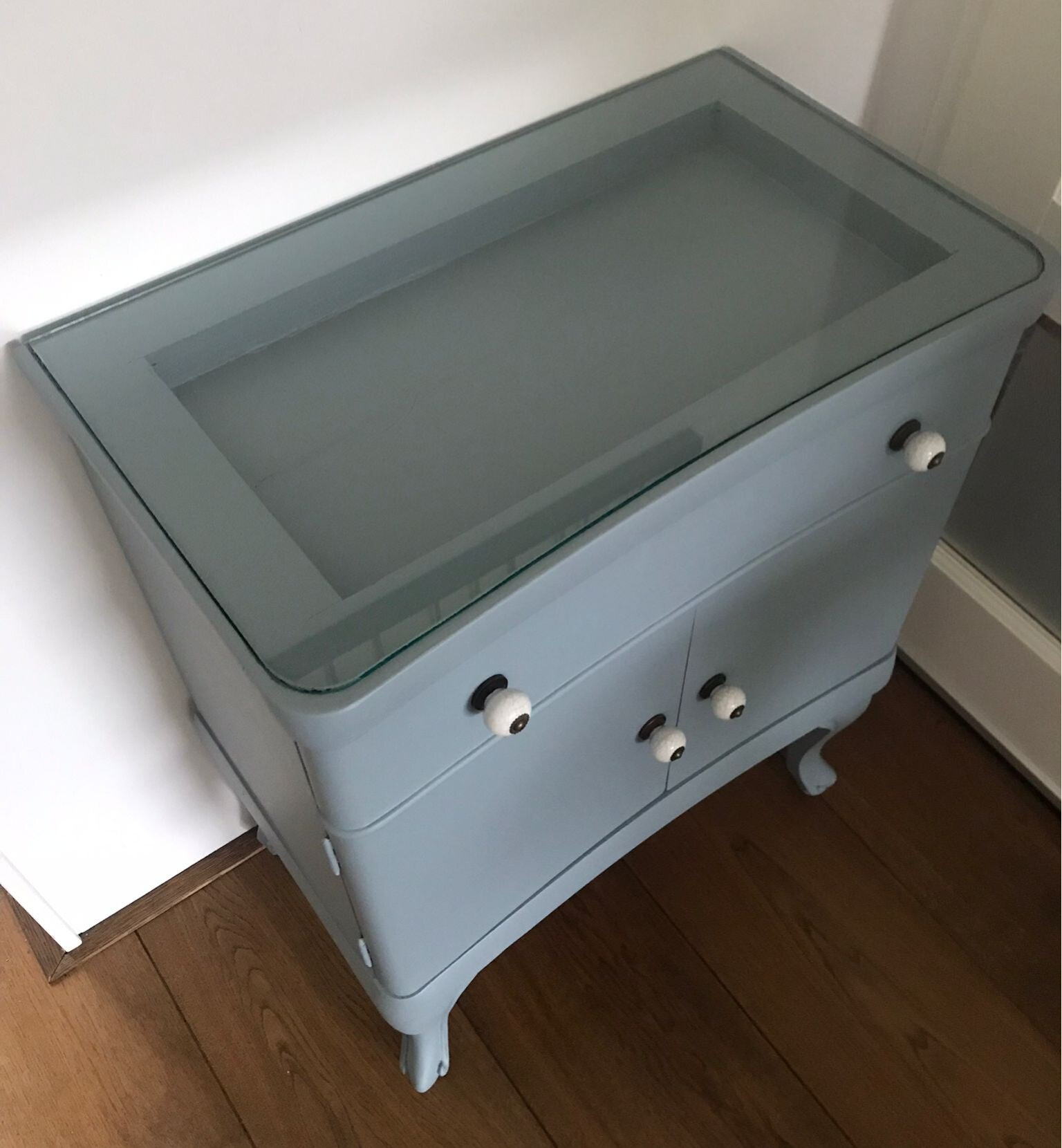 Een sierlijk ogend wandkastje in de kleur Paisley van Fusion Mineral Paint. Deze kleur is het beste te omschrijven als een vergrijsd blauw. Met andere woorden, de zachte kleur blauw voert hier de boventoon, maar heeft een enigszins grijze ondertoon in zich. In combinatie met de gemarmerde porseleinen knopjes matcht dat uitstekend. Op het kastje ligt een glasplaat. Deze is te verwijderen waardoor je in de uitsparing daar onder nog wat kan "tonen". Grappig detail vinden wij.