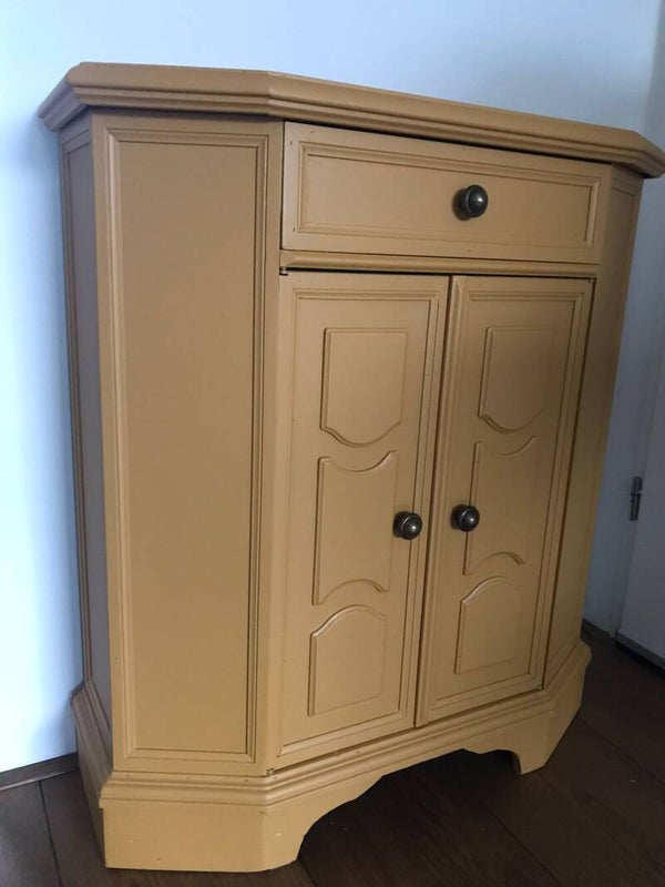 Een zeer handzaam model dit leuke en tevens praktische kastje. Uitstekend voor in een hal, maar ook super voor in een gastenverblijf of slaapkamer. Het geheel staat in de mooie kleur Mustard van Fusion Mineral Paint en heeft orginele messing knoppen op zowel lade als deurtje.