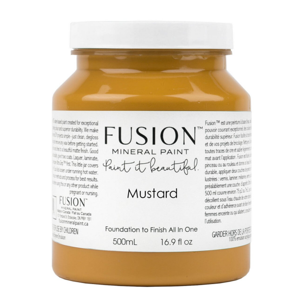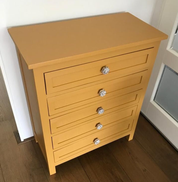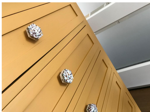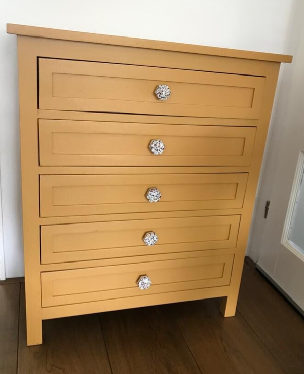 Fris en Fruitig dit ladenkastje in de kleur Mustard van Fusion Mineral Paint. De combinatie met de terazzo knopjes en het oker geel lijken voor elkaar bestemt.