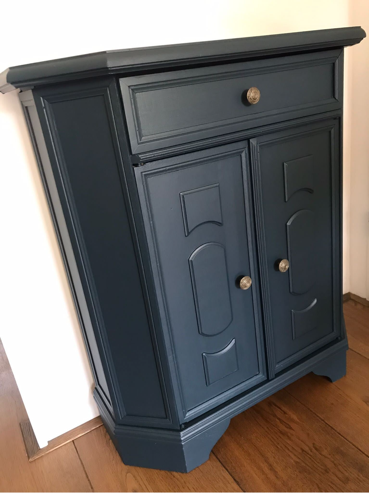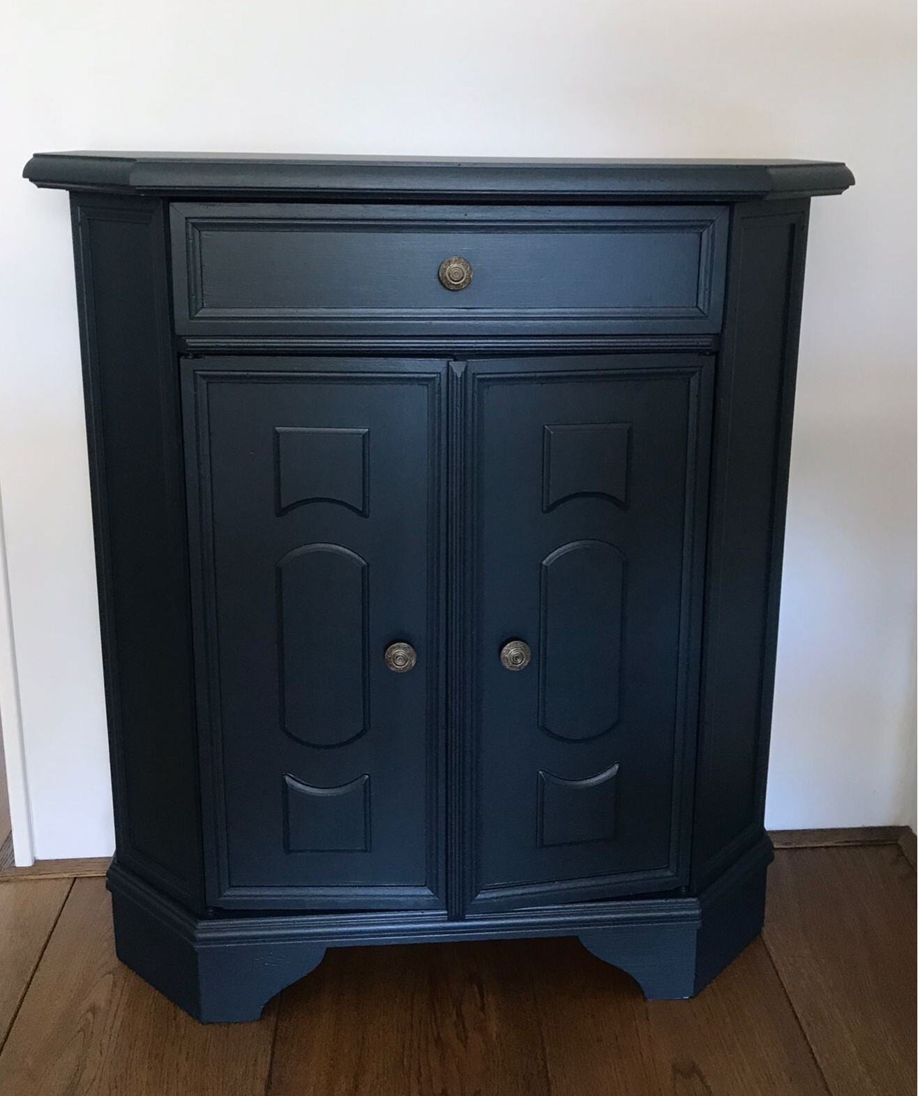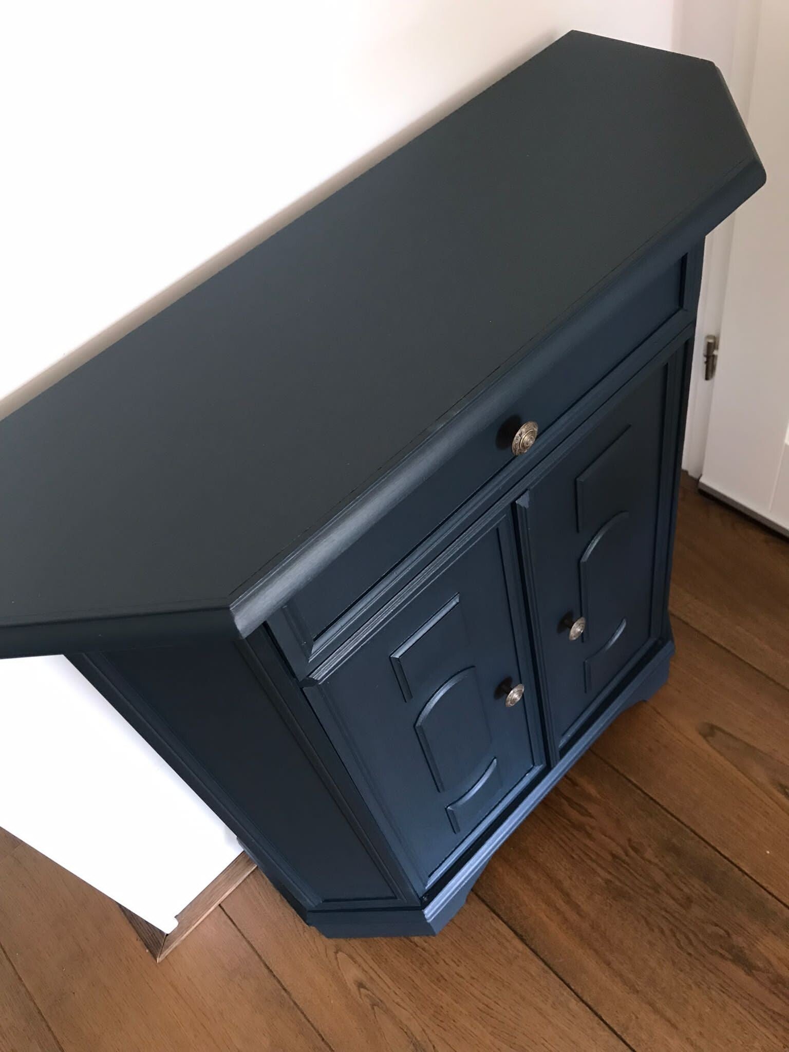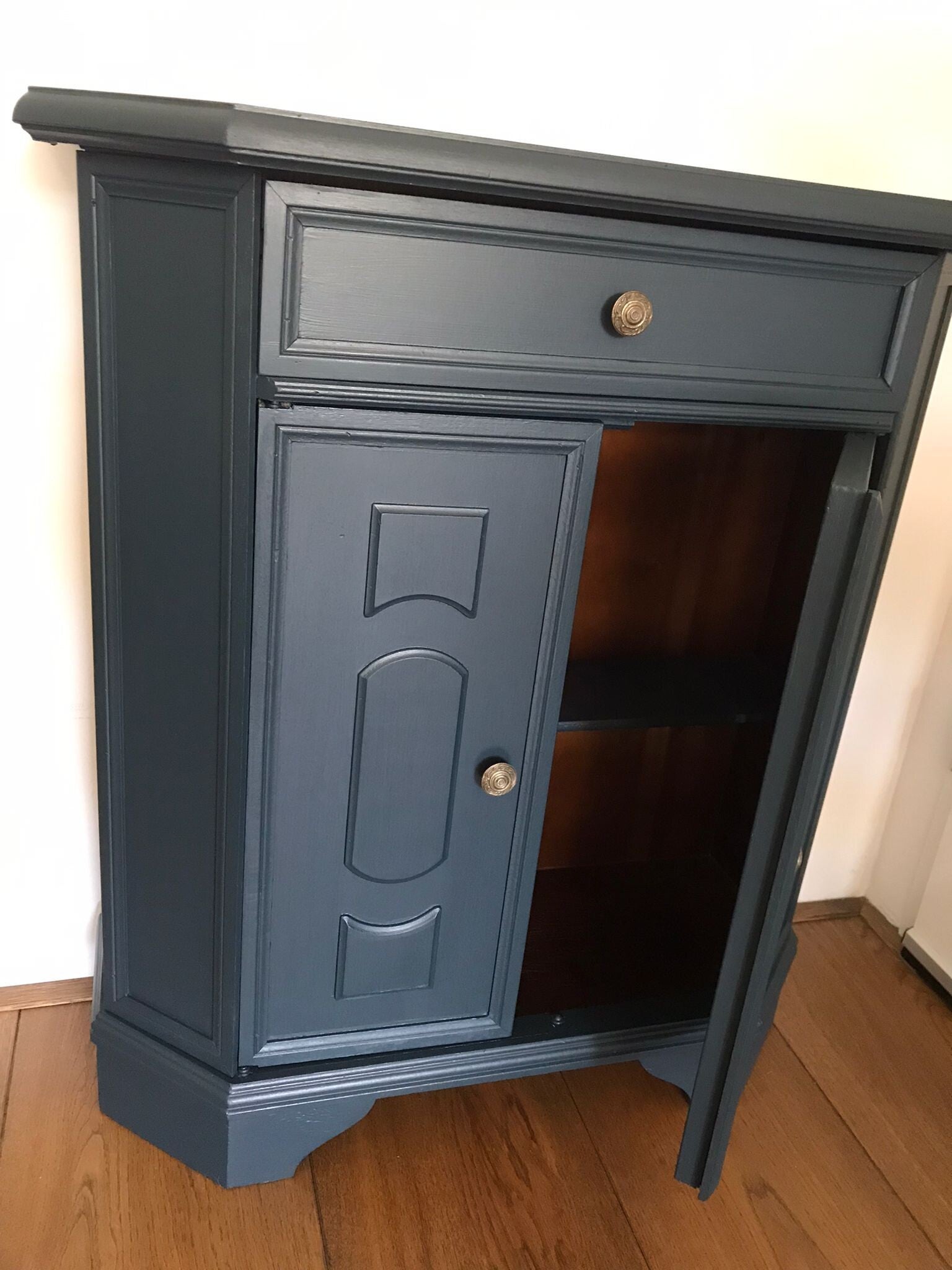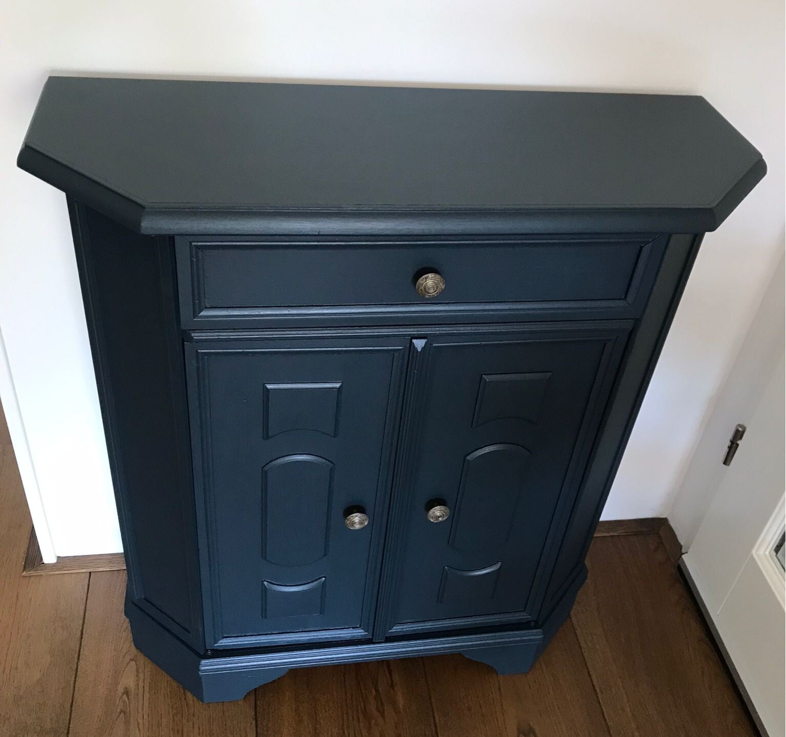 Een zeer handzaam model dit leuke en tevens praktische kastje. Uitstekend voor in een hal, maar ook super voor in een gastenverblijf of slaapkamer. Het geheel staat in de mooie kleur Chestler (Oceaan Blauw) van Fusion Mineral Paint en heeft orginele metalen knopjes op zowel lade als deurtjes.
