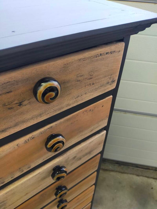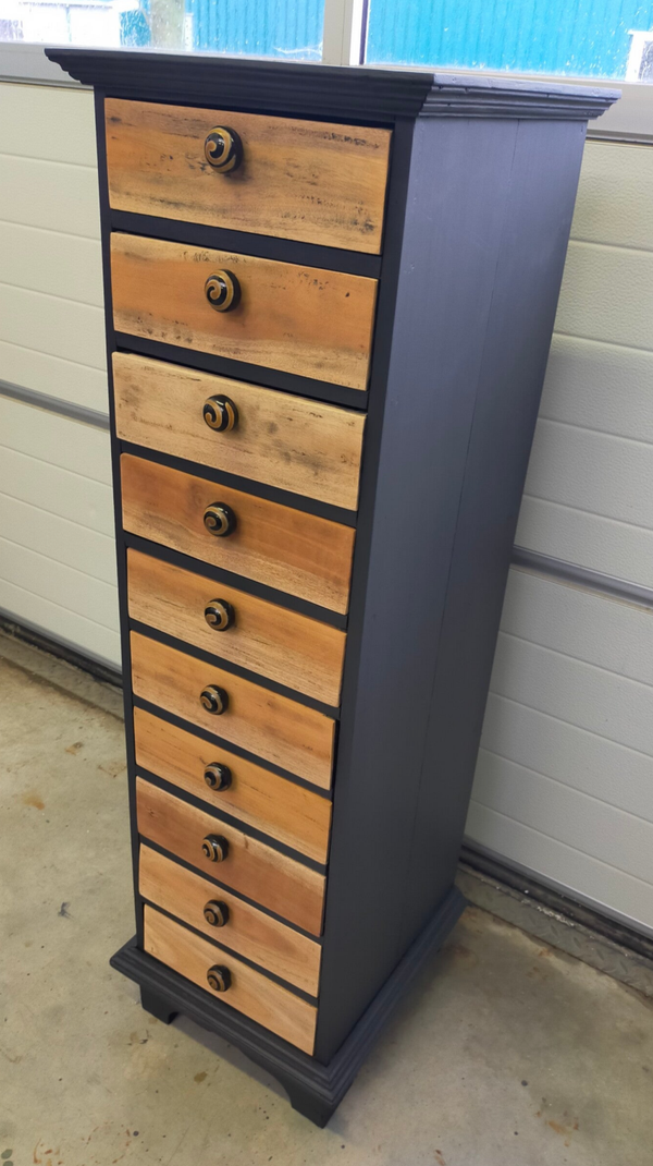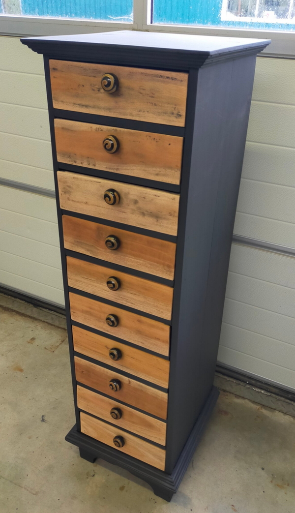 Een mooi formaat heeft deze zogenaamde apothekerskast. Niet zo breed, maar wel lekker wat hoogte en waanzinnig veel laadjes. Deze kast staat in de kleur Ash van Fusion Mineral Paint, die zich laat kenmerken door zijn diep antraciet kleur. De lades zijn voorzien van bijpassende knoppen en hebben hun natuurlijke look weer terug gekregen, waardoor het mooi en uniek geheel is.