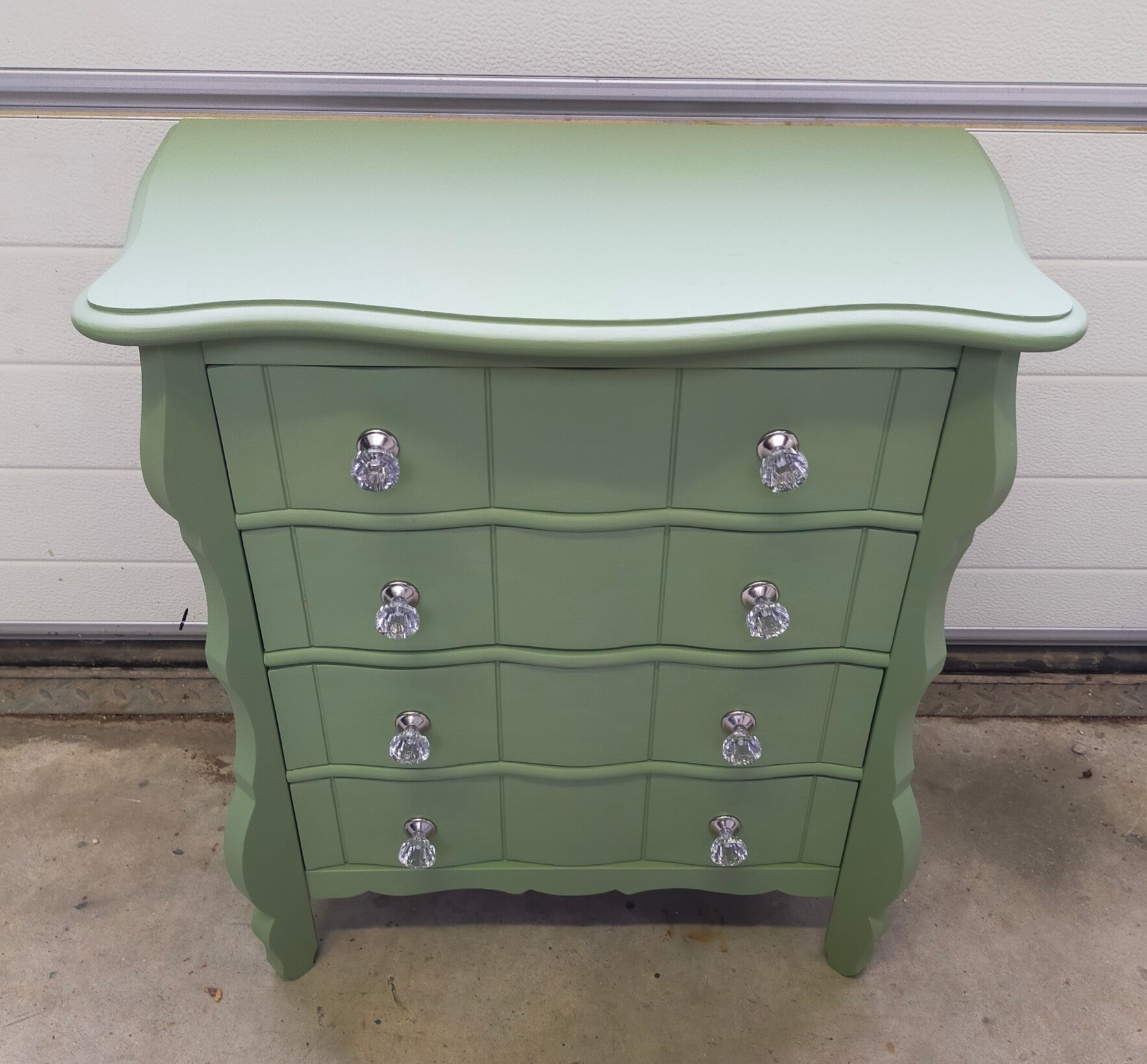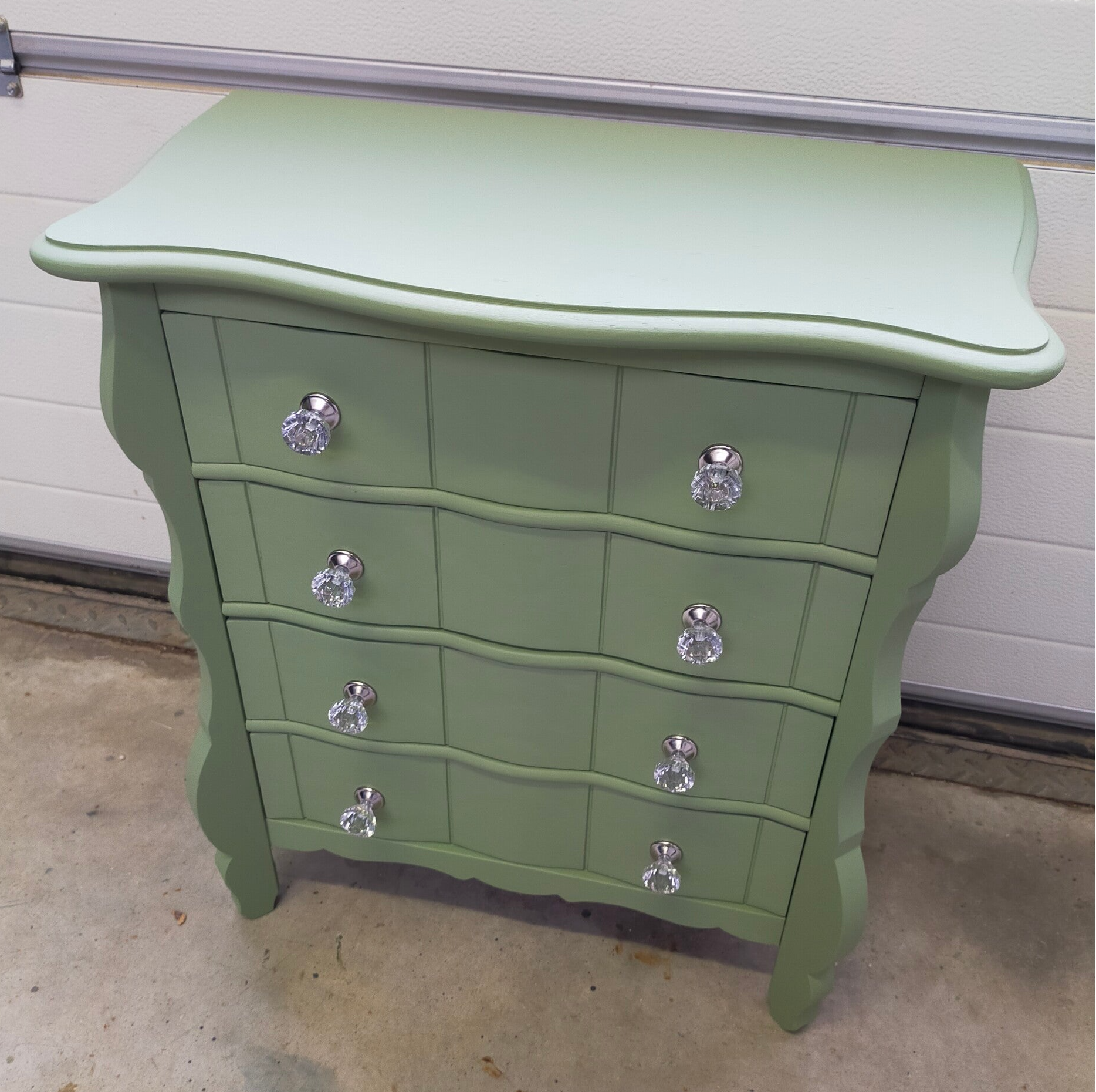 Dit kastje noemen ze ook wel een buikkastje of harmonica kastje. Dit komt uiteraard door de verfijnde en mooie vormgeving. Het beslag is vervangen door mooie glas knopjes en het geheel staat in een frisse groene kleur van Fusion Mineral Paint. De lades lopen prettig en soepel.