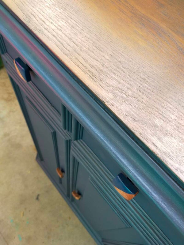 Dit formaat kom je niet vaak tegen! Heerlijk half hoge ondiepe kast, met voldoende planken achter de deurtjes. De combinatie van lade en deurtjes is natuurlijk ideaal. Zowel lade als deuren sluiten prima. Deze woest stevige kast staat in de kleur Willowbank van Fusion Mineral Paint enis een mooi intens blauwe tint. Wat vervolgens weer erg goed werkt met de hippe knoppen en de hout details. Het hout is overigens afgwerkt met een matte cappuccino finish, wat het hout beschermt en ter gelijketijd een mooie uitstraling geeft.