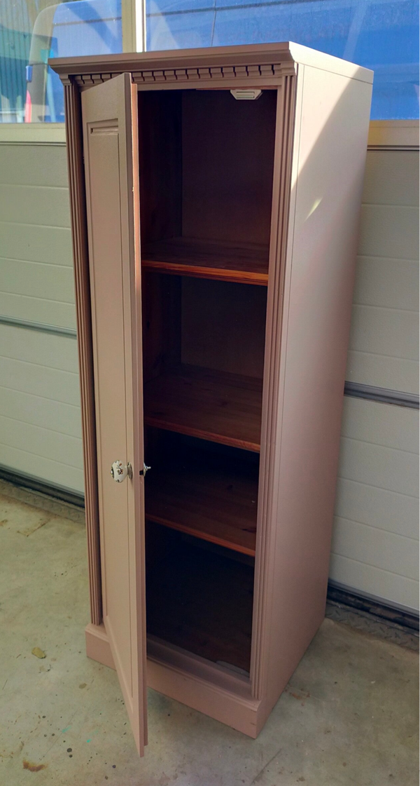 Een bescheiden formaat 1 deurskast in een zeer prettige oud roze, enigszins nude kleurtje Damask van Fusion Mineral Paint. Achter de goed sluitende deur een 3 tal planken, waardoor er voldoende opbergruimte ontstaat. Dit kastje is uitermate geschikt als bijvoorbeeld boekenkastje, maar zo ook niet mis staan op een baby/kinderkamer. Natuurlijk zijn er nog talloze plaatsen op te noemen waar dit kastje kan staan. De bijpassende knop op de deur mag natuurlijk niet ontbreken.
