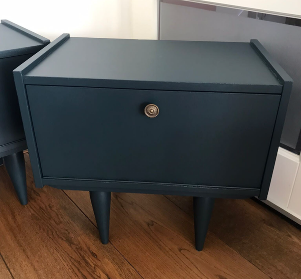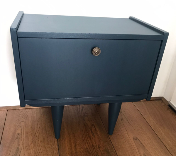 Super iconisch retro setje nachtkastjes. Rechtstreeks uit de jaren 60, maar dan met een flinke upgrade naar het heden. Deze 2 kastjes hebben de kleur Chestler van Fusion Mineral Paint gekregen en zijn afgewerkt met orginele oude knopjes, wat een leuke en aparte twist geeft. De kleur Chestler laat zich het best omschrijven als een donker blauw, met een bonk aan warmte inzich.
