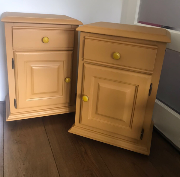 De kleur Mustard van Fusion Mineral Paint laat zich het best omschrijven als oker geel. Deze warme gele tint straalt tevens een dosis lef uit. Deze set nachtkastjes staan dan ook garant voor net even wat anders dan standaard. Dit uiteraard mede door de kleur, maar ook zeker door de details in het houtsnijwerk en de toffe bijpassende knoppen.